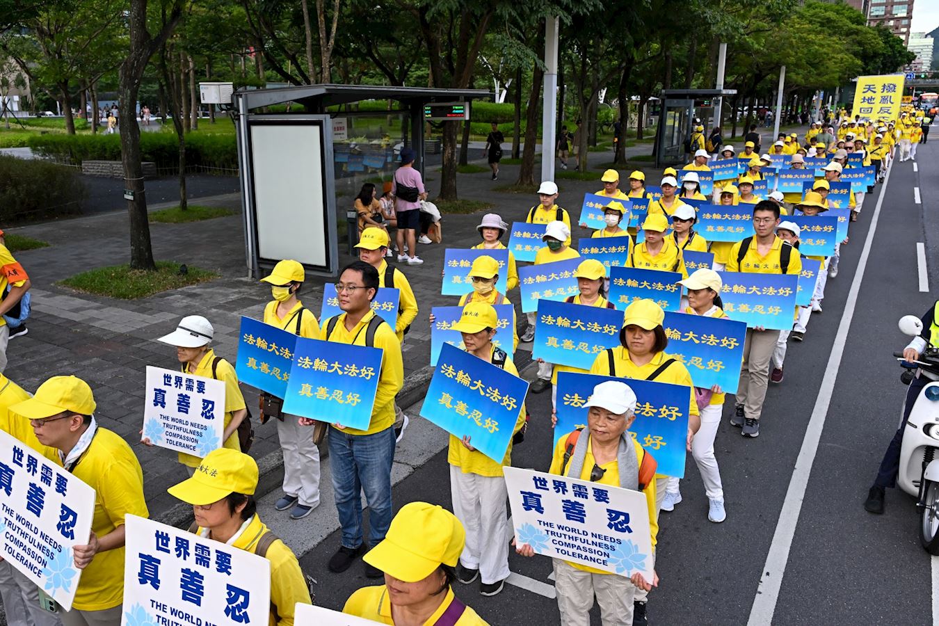 游行队伍由台湾天国乐团打头阵,紧接着是四大方阵:“大法洪传”、“千古奇冤”、“三退大潮”及“结束迫害”,最后由腰鼓队压轴。游行队伍中,学员手持显目的横幅:“世界需要真善忍”、“中共迫害真善忍 天理不容”、“了解真相是得救的希望”、“中国不是中共”、“制止中共活摘器官”、“解体中共 结束迫害”,直接传递真实讯息。