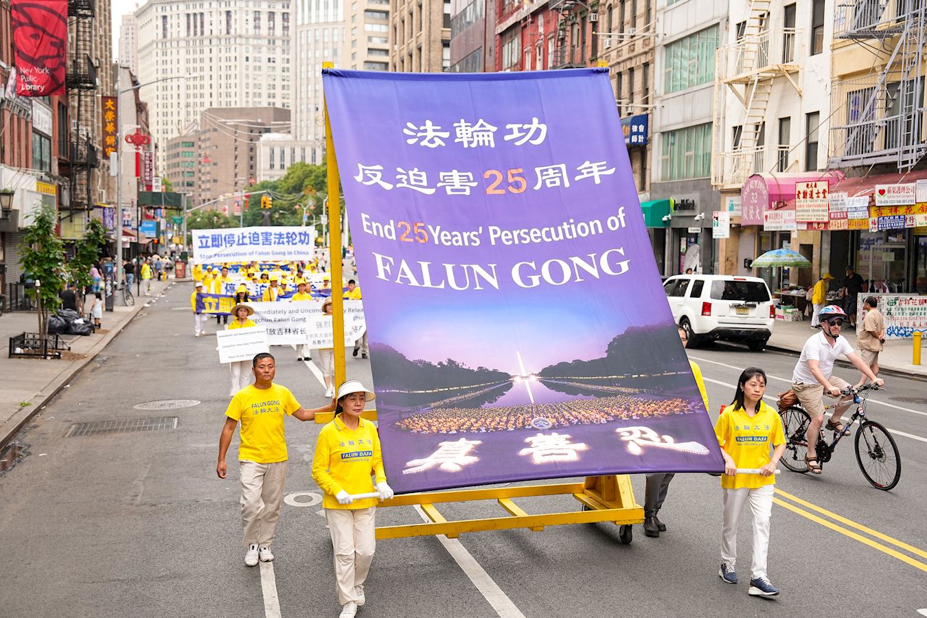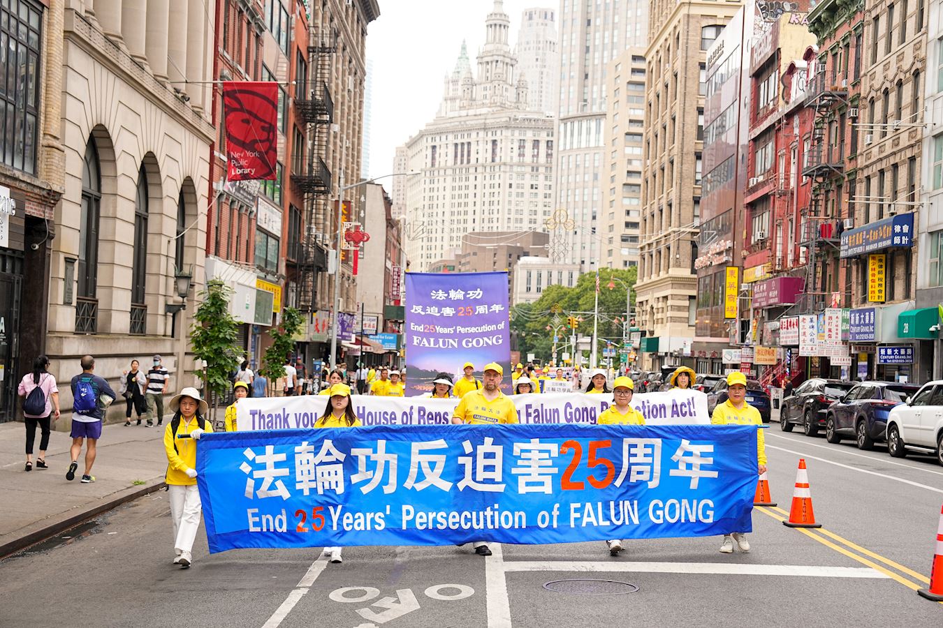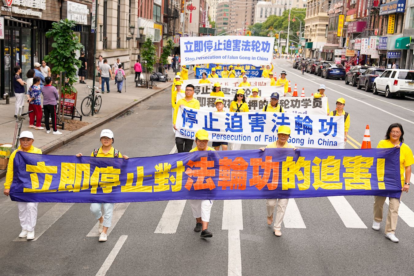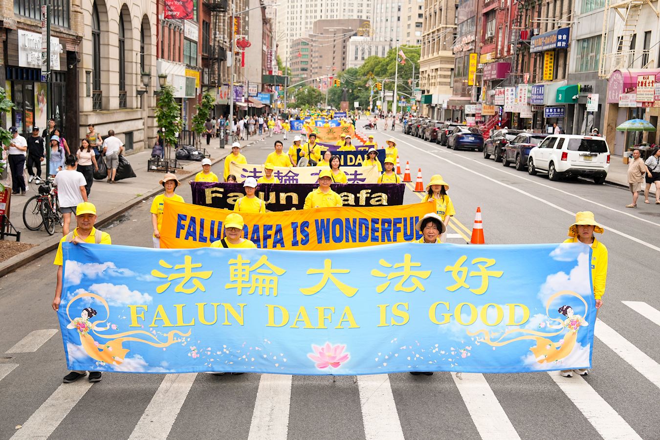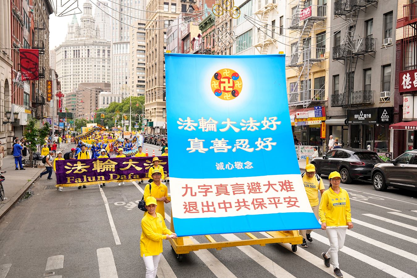 【明慧网二零二四年七月二十三日】二零二四年七月二十日是法轮功反迫害二十五周年,这一天,纽约部分中西族裔法轮功学员上千人在纽约市曼哈顿的华埠举行盛大游行,要求中共立即停止迫害法轮功,并声援4.3亿中国人退出中共党、团、队组织。华埠各族裔民众对游行赞不绝口,感佩法轮功学员二十五年来坚持不懈和平反迫害的精神。华人表示,法轮功是中华民族的希望。
