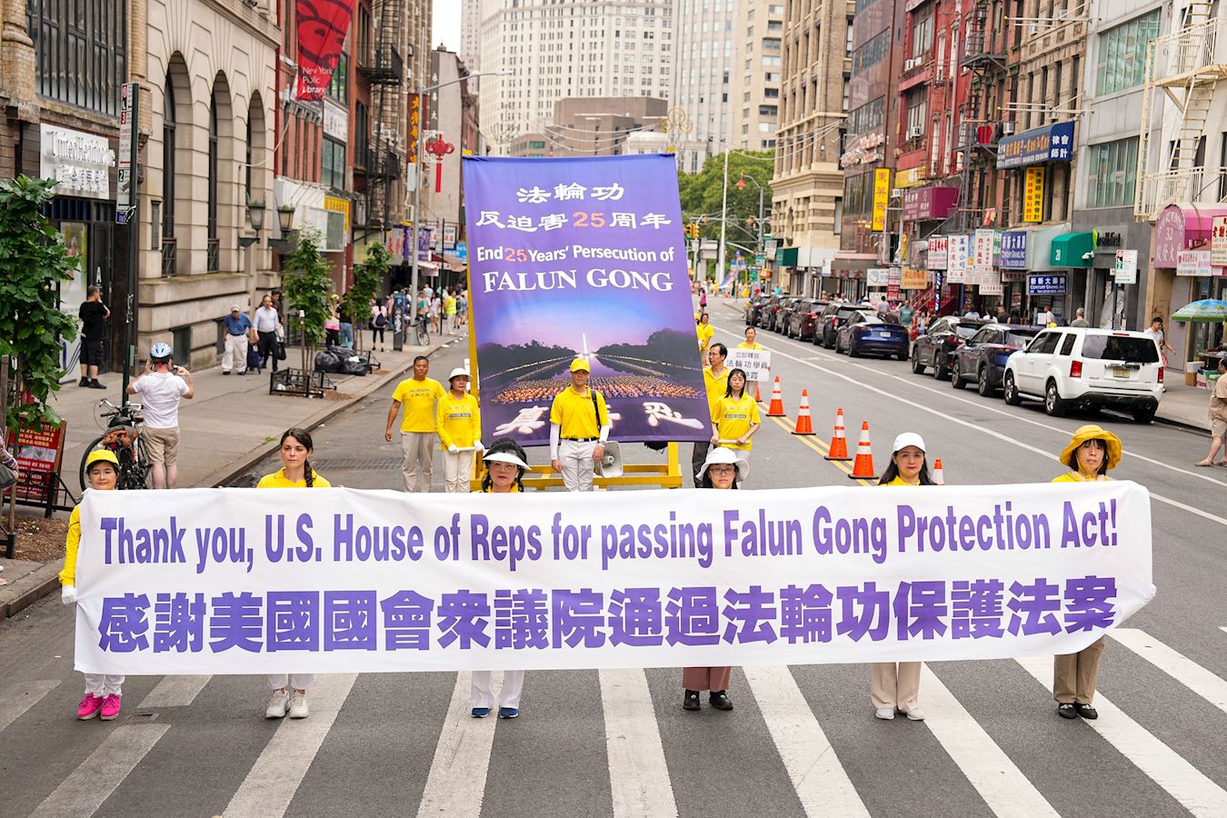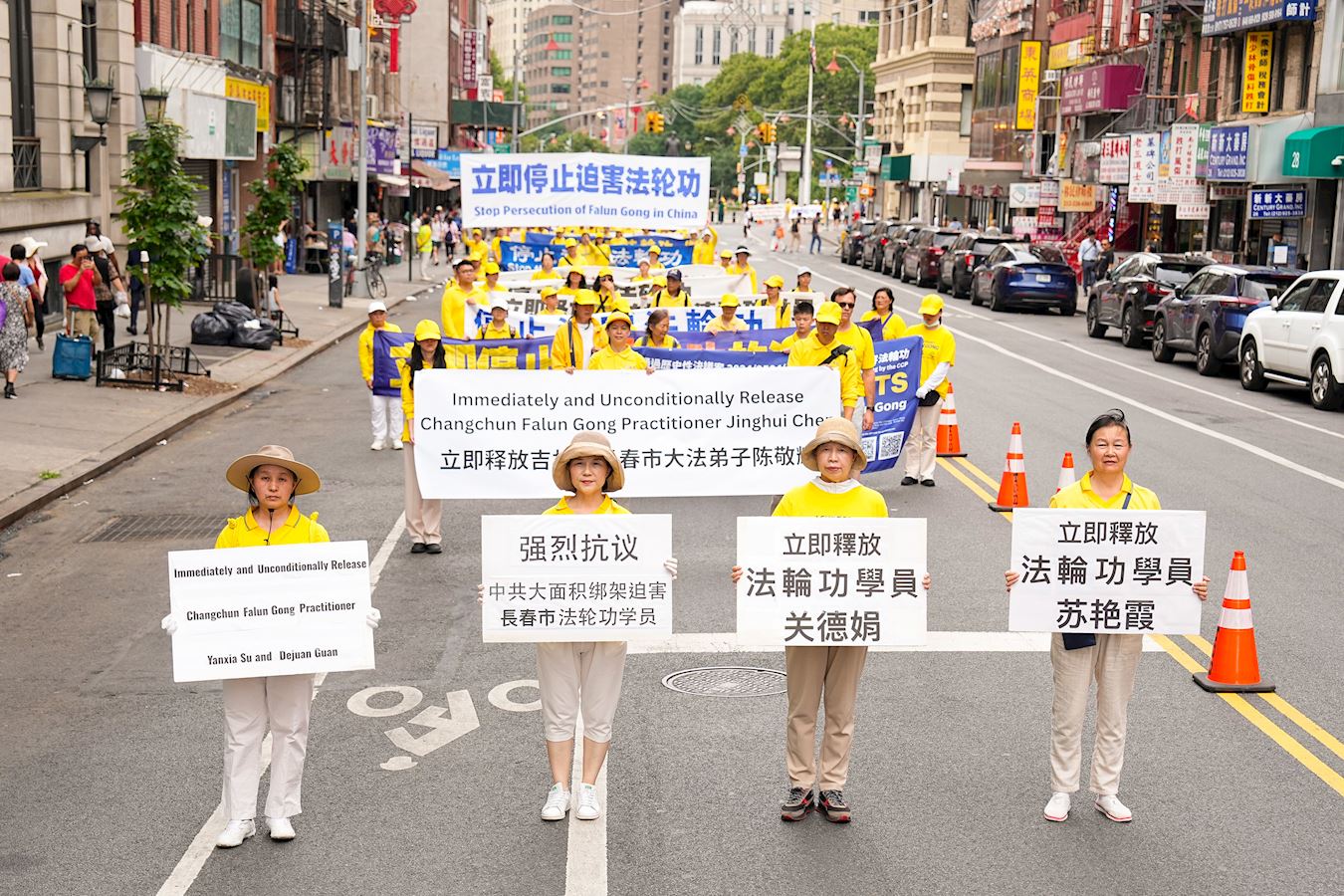 图7~19:二零二四年七月二十日,纽约华人历史最悠久的曼哈顿唐人街迎来了法轮功学员反迫害25周年大游行,图为第二方阵“停止迫害法轮功”。