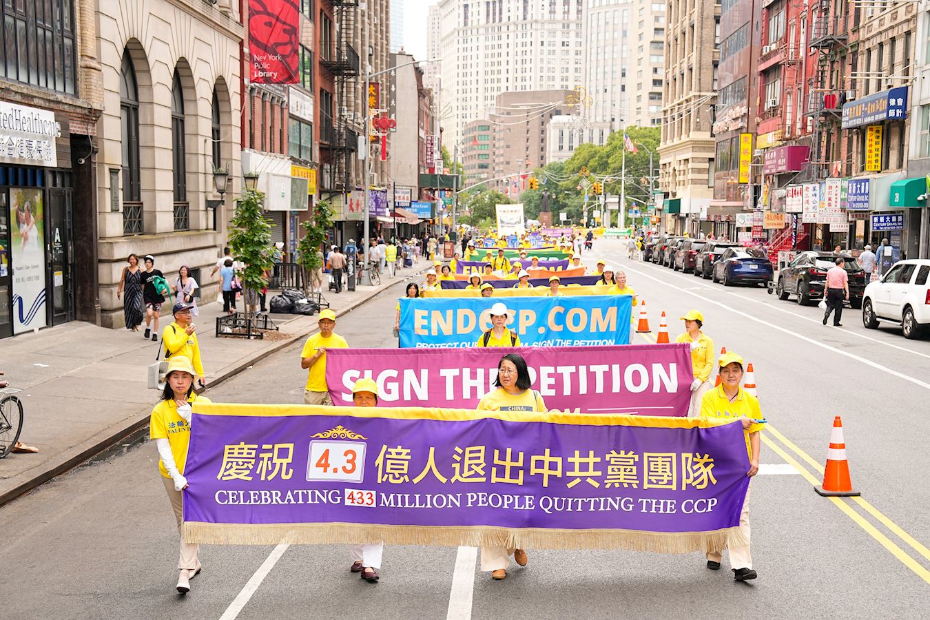 这天,纽约华人历史最悠久的曼哈顿唐人街乐声嘹亮,队伍浩浩荡荡。游行分三大方阵,分别是:“法轮大法好”、“停止迫害法轮功”和“声援4.3亿中国人退出中共党团队。