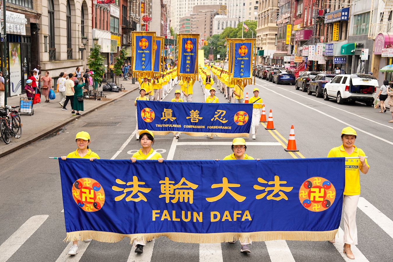 图1~6:二零二四年七月二十日,纽约华人历史最悠久的曼哈顿唐人街迎来了法轮功学员反迫害25周年大游行,图为第一方阵“法轮大法好”。