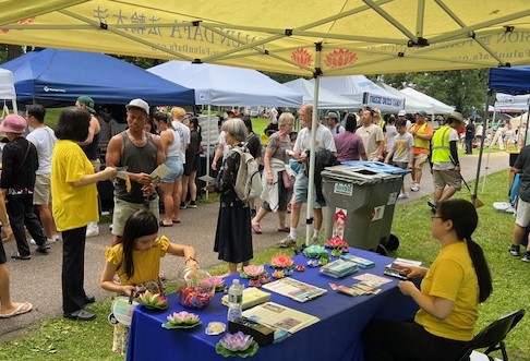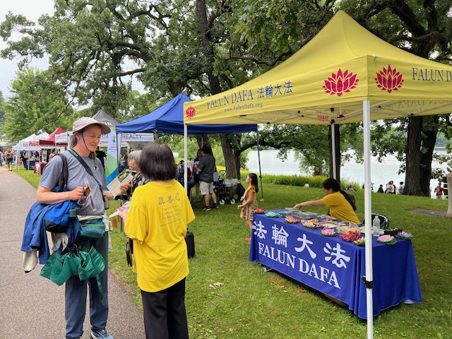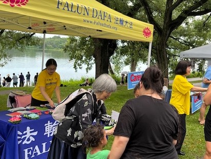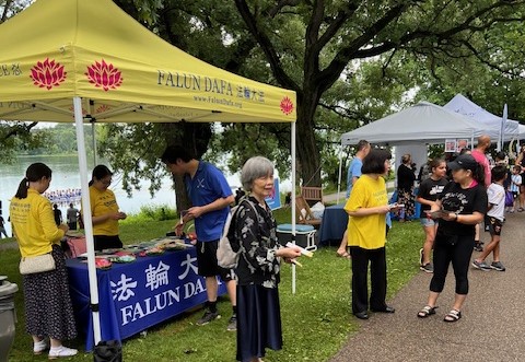 【明慧网二零二四年七月二十三日】二零二四年七月十三日,明州法轮功学员参加了在圣保罗费棱湖畔公园(Phalen Regional Park)举行的龙舟节(Dragon Festival),并在舞台上演示了法轮功五套功法。人们看到平静柔和的功法,纷纷赞赏真善忍的美好。