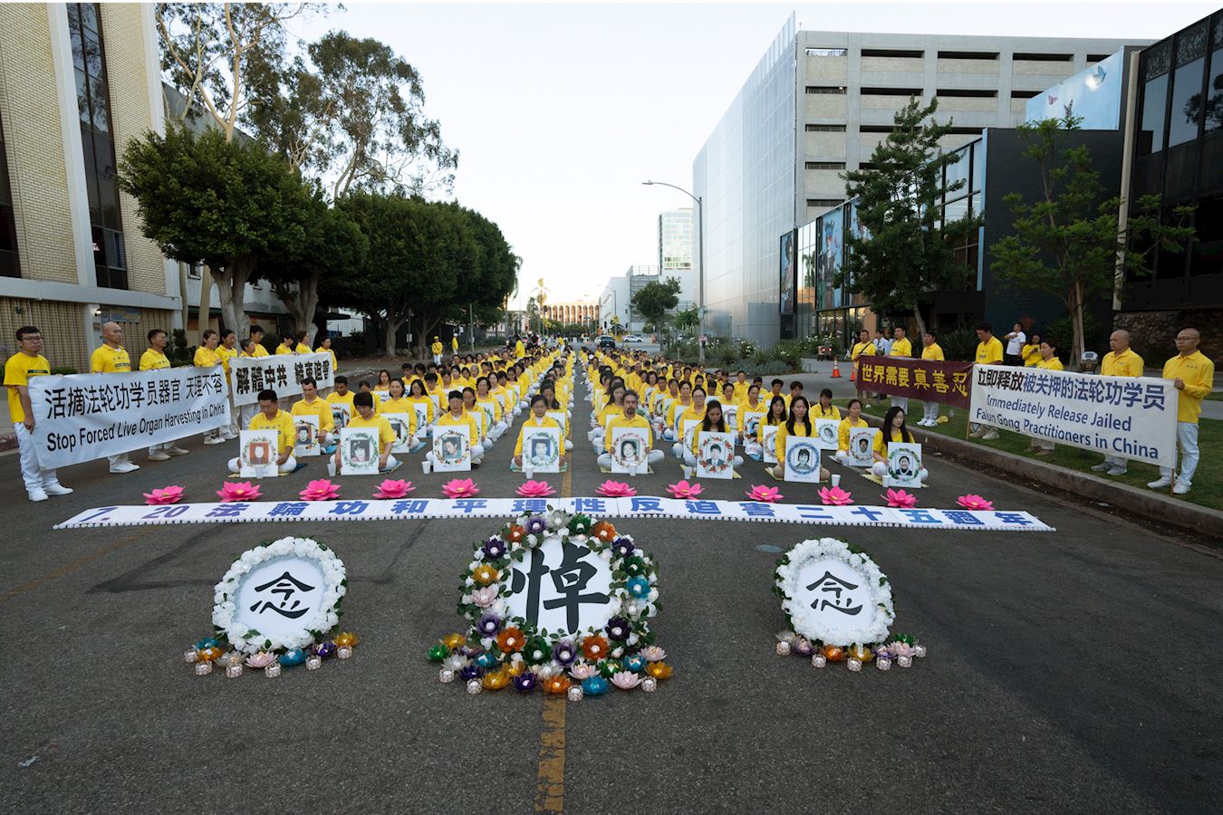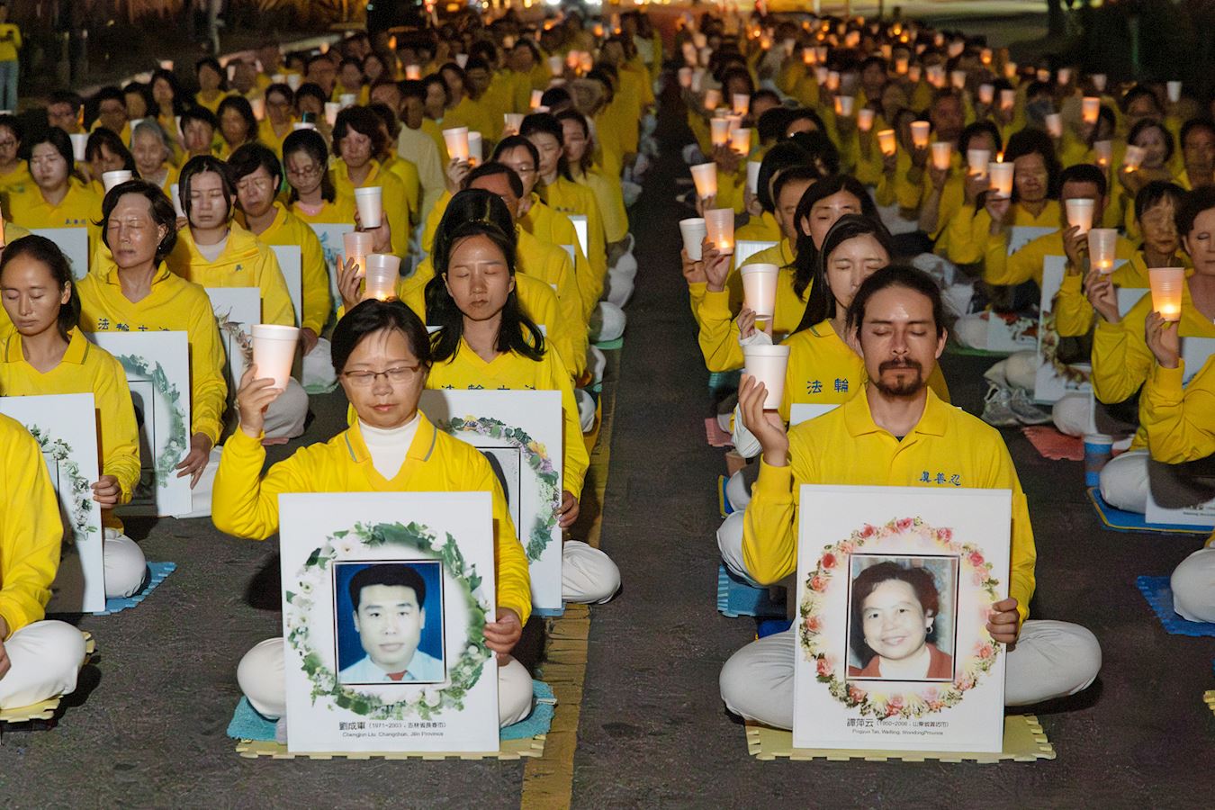 当晚,身穿黄色服装的法轮功学员静静地盘坐在中领馆门前。他们举起烛光,手扶被中共迫害致死的法轮功学员遗像,在悲壮肃穆的乐声中,悼念为维护真、善、忍信仰而失去生命的法轮功学员。
