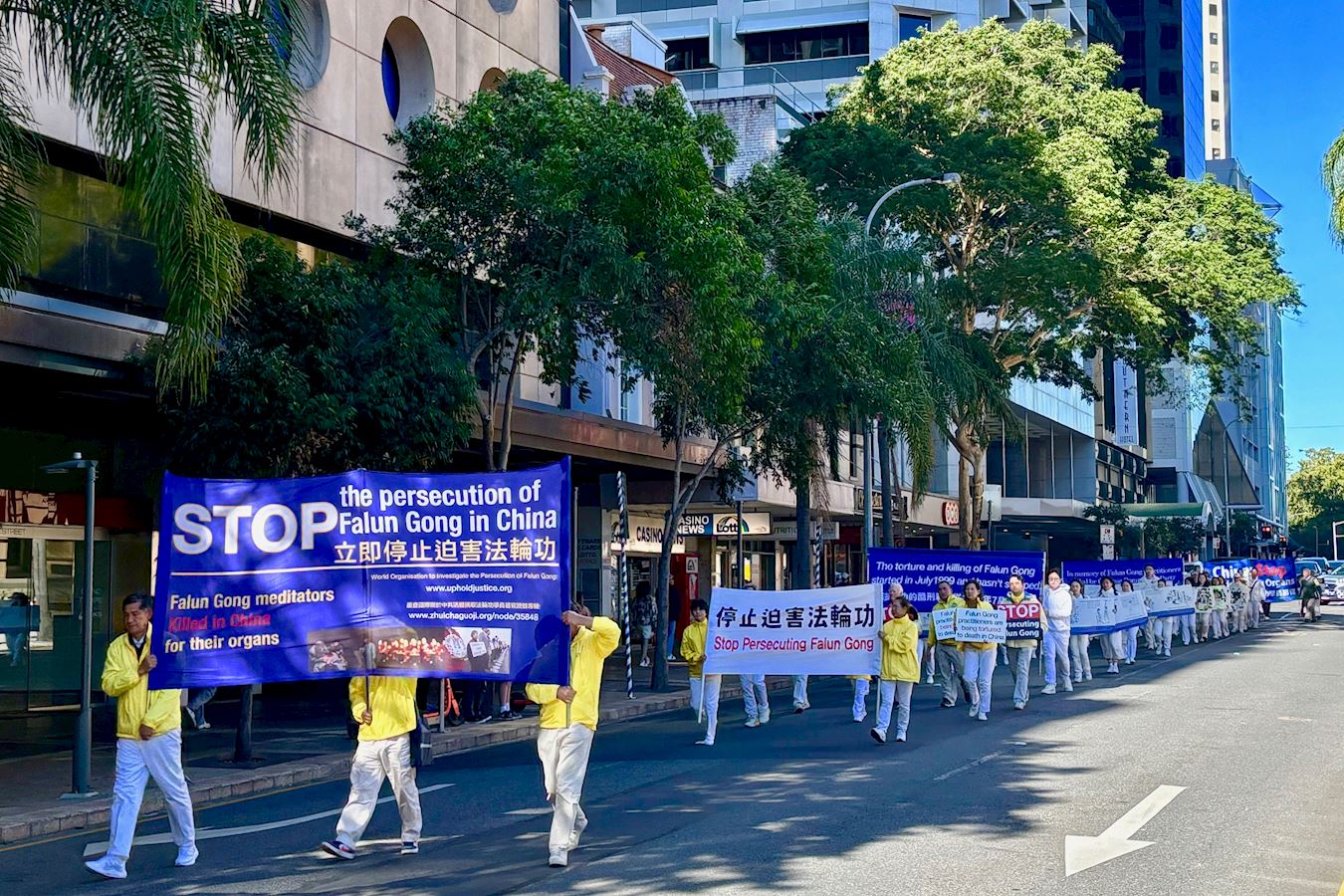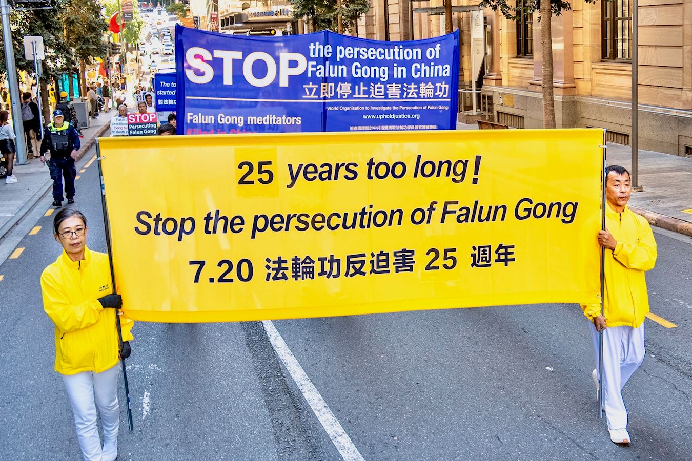 他表示:“法轮功学员仍遭受中共的迫害,法轮功学员坚守正信、和平理性的反迫害长达二十五年之久,我仍然举着横幅,走在布里斯班的街道上,坚定的表达我对中国法轮功学员的支持,谴责残暴强行活体摘取法轮功学员器官的罪行,呼吁世界上善良的人们共同制止这场迫害。”
