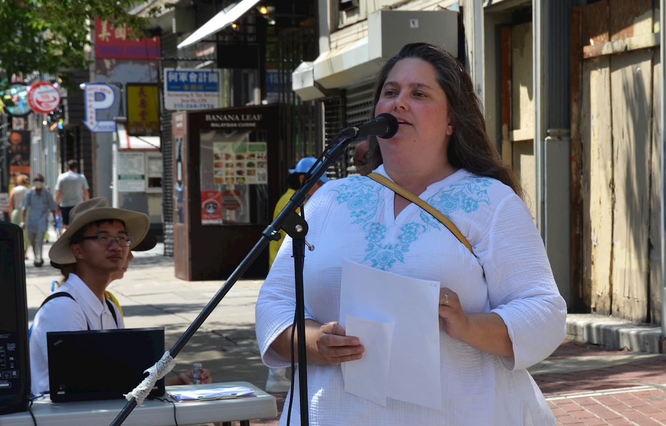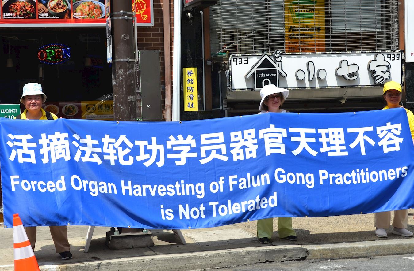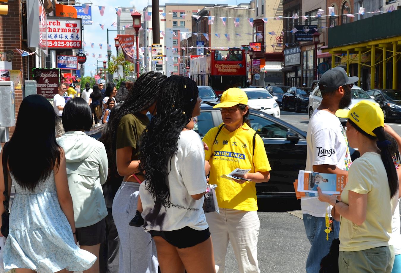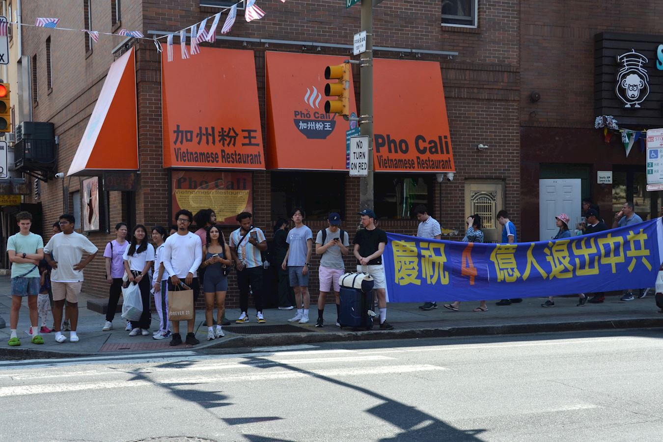 图1:二零二四年七月二十一日,大费城地区部分法轮功学员在费城中国城举行集会,纪念反迫害二十五周年暨声援四亿三千万中国人退出中共组织。