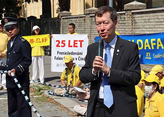 来自捷克共和国的法轮功学员7月19日在中共驻布拉格大使馆前集会,他们演示功法、打横幅,向民众讲述真相,要求中共立即停止迫害。