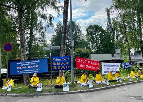 二零二四年七月十八日星期四,天气晴朗,芬兰法轮功学员在首都赫尔辛基中共大使馆前举行和平抗议活动。