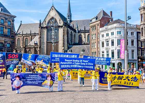 法轮功反迫害25年之际,荷兰法轮功学员来到首都阿姆斯特丹著名的达姆广场,举行和平抗议活动,呼吁立即停止迫害法轮功。