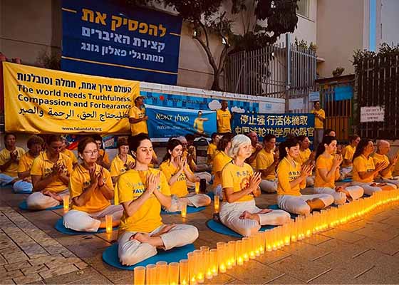 以色列法轮功学员7月18日聚集在特拉维夫中共大使馆前,举行烛光守夜,悼念那些被中共迫害致死的法轮功学员。