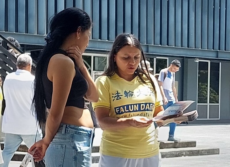 来自委内瑞拉的建筑师尼尔森(Nelson)当天到访麦德林,偶然路过学员们的活动现场,他了解到法轮功的基本情况,并观看了功法展示。尼尔森表示,法轮功是一门非常与众不同的法门,虽然是第一次听说,但他想亲自实践一下。学员给了他委内瑞拉当地炼功点的信息,以便他回国后可以学功。
