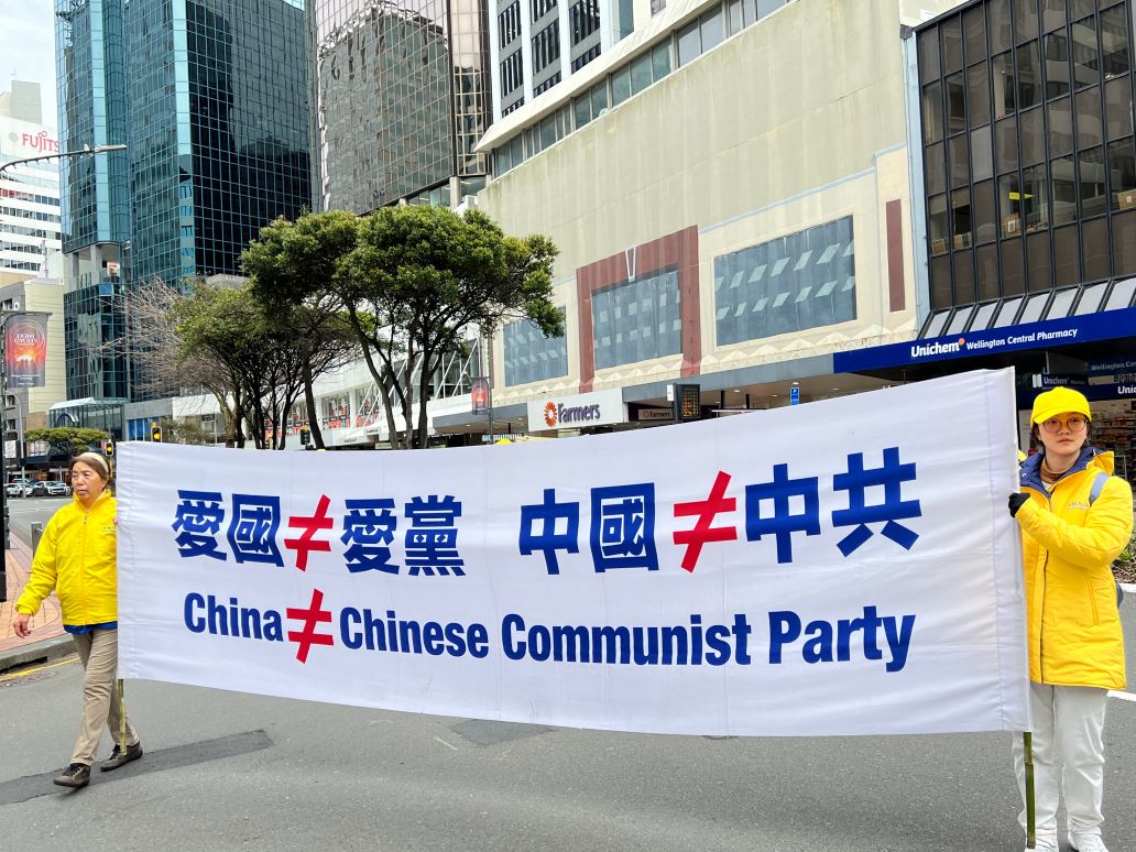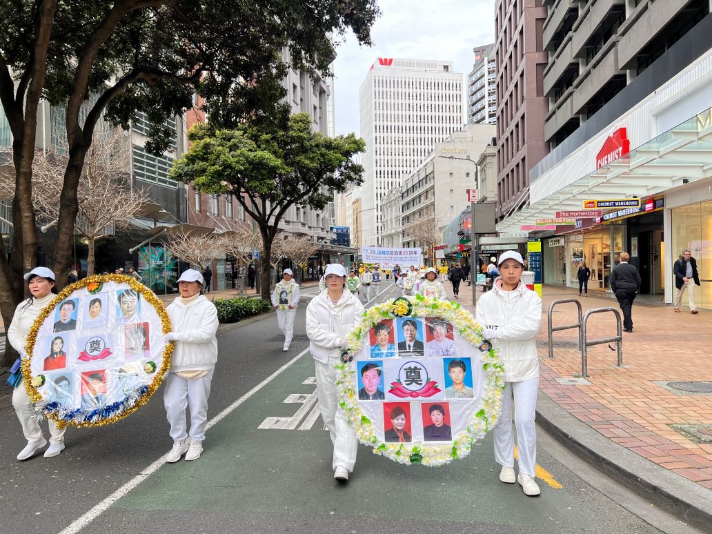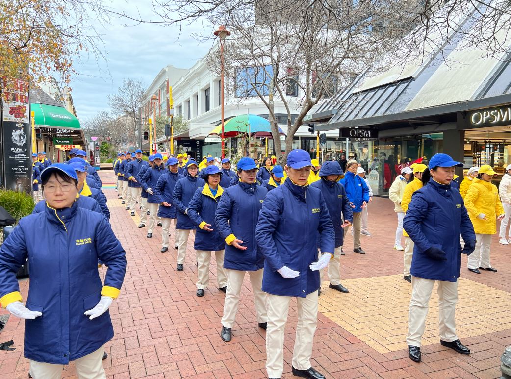 临近中午时分,反迫害的游行正式开始。由法轮功学员组成的天国乐团打头阵,游行队伍沿着市中心,首先来到米德兰(Midland)公园,在短暂的停留和集会后,继续出发,最后到达新西兰国会大厦。