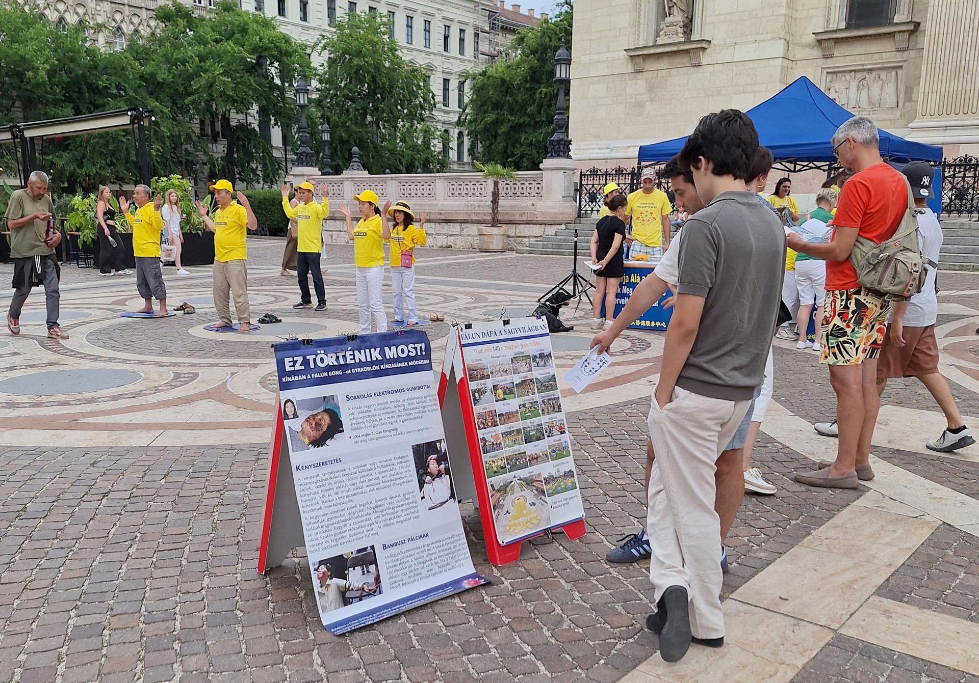 每逢周末,法轮功学员会在布达佩斯人们喜爱的重要建筑之一——圣斯蒂芬大教堂前设立了信息台。众多国外和当地游客都会来参观这座位于首都中心的教堂。法轮功信息台前经常有许多市民及游客驻足观看,有的拍照,有的想了解更多关于法轮功的讯息,有的想学炼功法,成了當地一道真相風景線。