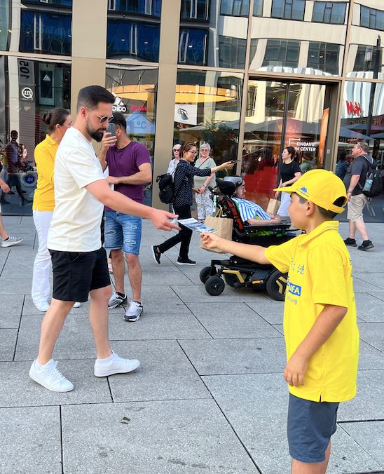 一位年轻人站在一旁观察学员们的活动,然后他向一位学员了解什么是法轮功。他对真、善、忍的价值观尤其感兴趣,他认为这些价值观会给人们带来持久的幸福。谈话结束后,他报名参加了两天后在法兰克福举办的九天班,希望能进一步了解法轮功。