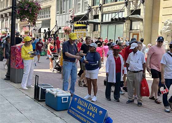 - 加拿大国庆节 中西方人士了解法轮功- 七月一日,加拿大迎来157周年国庆日,部分法轮功学员在渥太华市中心繁华的步行街斯巴克斯街炼功、讲真相,与加拿大民众分享节日快乐。