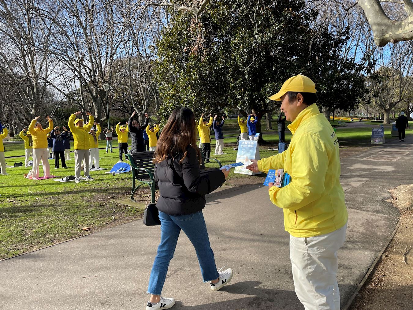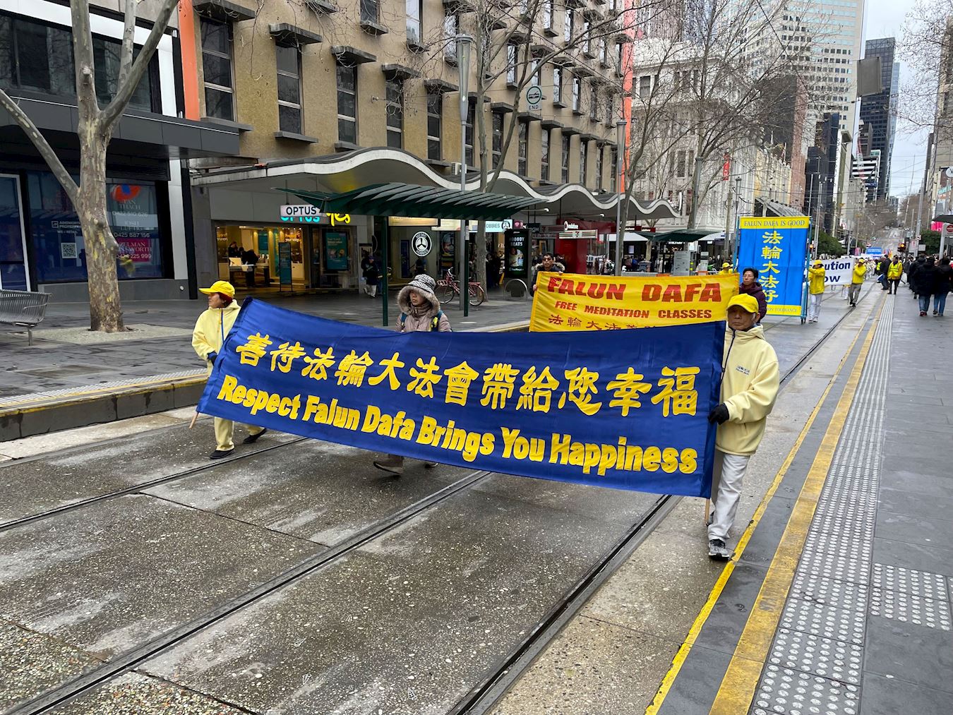 七月二十日,墨尔本市中心商业街举行的游行和集会都吸引了大量市民和游客观看,很多人接过法轮功真相传单了解详情。