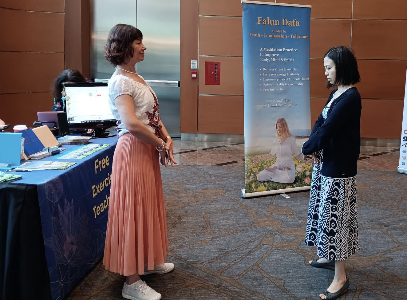 来自主办方的泽纳·达乌德曼内什(Zeinab Davoudmanesh)女士邀请了法轮功学员们在舞台上向观众展示法轮功五套功法;她还来到法轮大法展位表达了她的欢迎,她说:“我认为真、善、忍的理念是全世界每个人都需要的。”