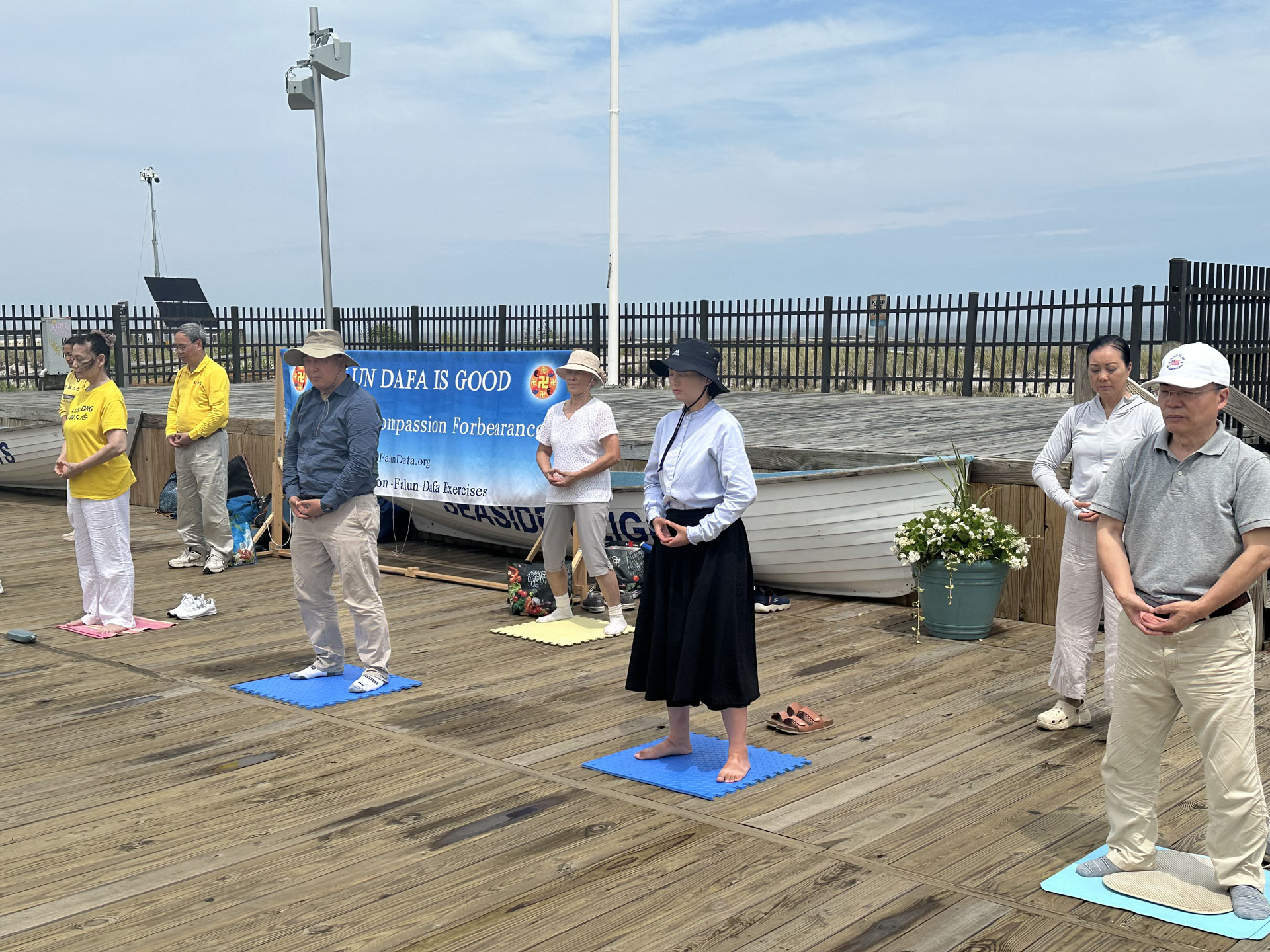 图2~4:新泽西州法轮功学员在海滨高地镇木板路上展示功法。