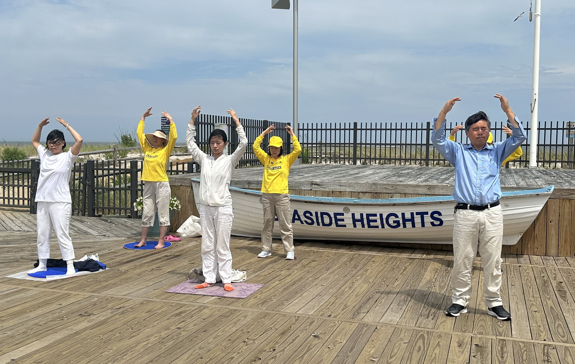 图1:法轮功学员在海滨高地镇木板路上展示功法,吸引游客们主动要求学功。图为罗格斯大学的年轻学生们在学习第二套功法。