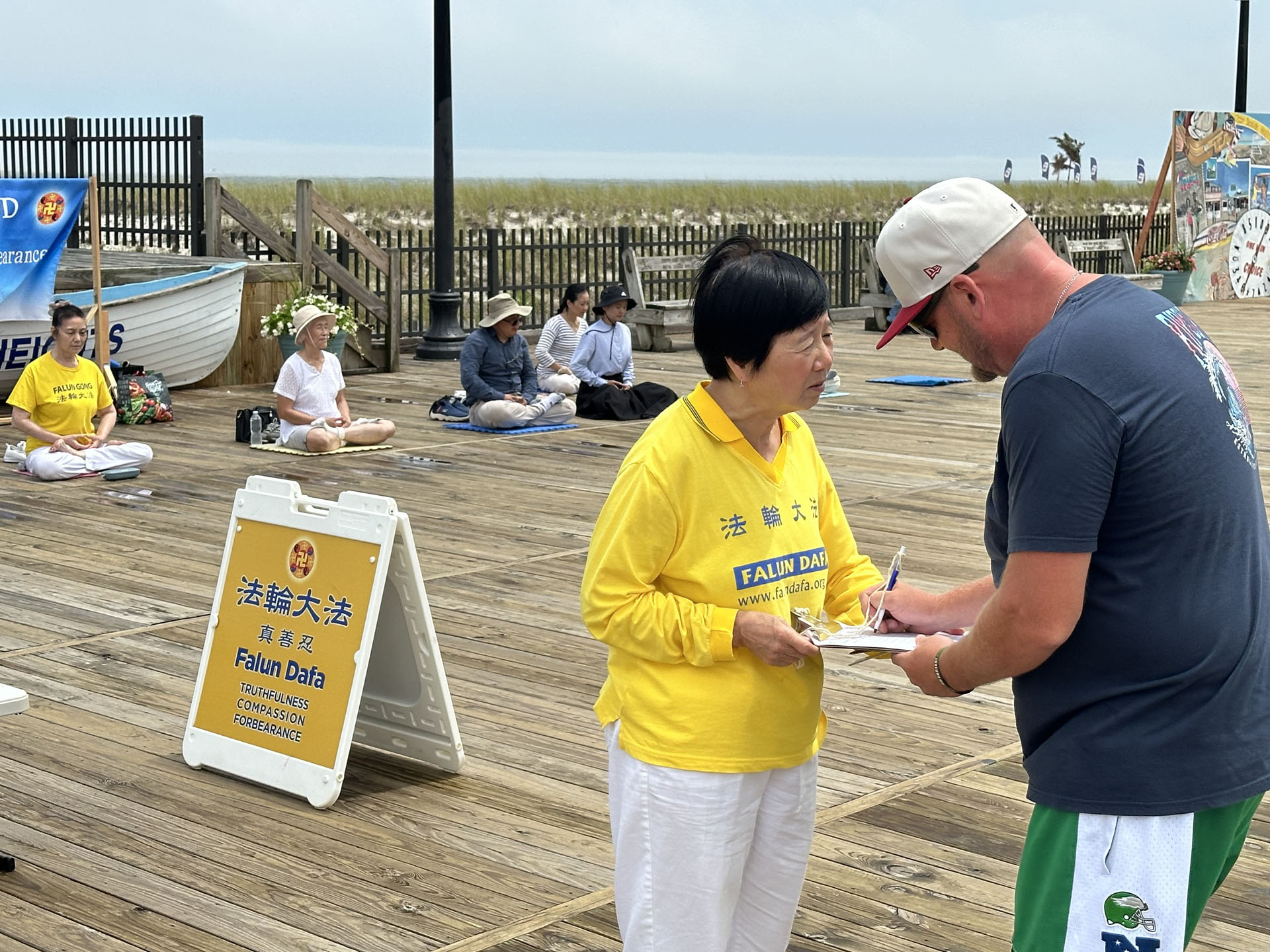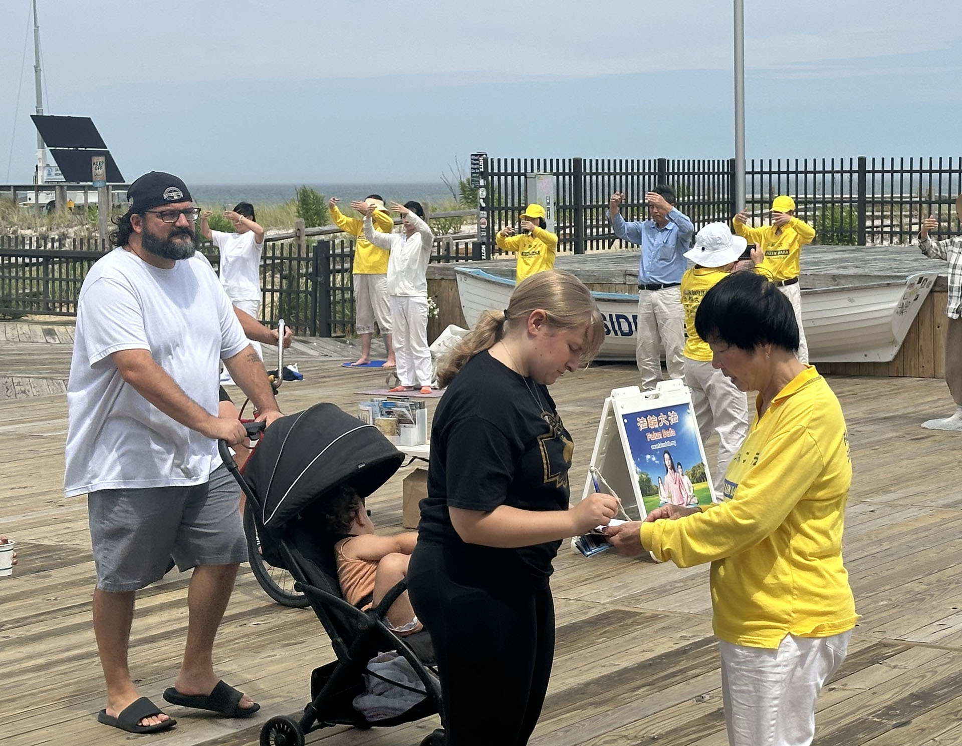 【明慧网二零二四年七月四日】二零二四年六月三十日,美国新泽西州部分法轮功学员今夏首次来到海滨高地镇(Seaside Heights),向众多游客介绍法轮功(也称法轮大法),并揭露中共长期迫害法轮功的真相。法轮功学员祥和的炼功场面,成了海滨步行街上一道与众不同的难得风景线。游客们纷纷主动要求学功,或在反迫害签名表中签名。