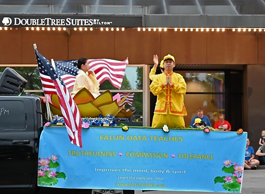 文化名城埃文斯顿市是美国名校西北大学所在地。游行开始前,街道两旁已挤满了迎接节庆的居民和游客。法轮功学员展示了旗阵、鼓阵、花车、功法演示等方阵。“法轮大法好”、“真善忍”等悬挂在花车的四周,法轮功学员在精美的花车上演示法轮大法五套功法。