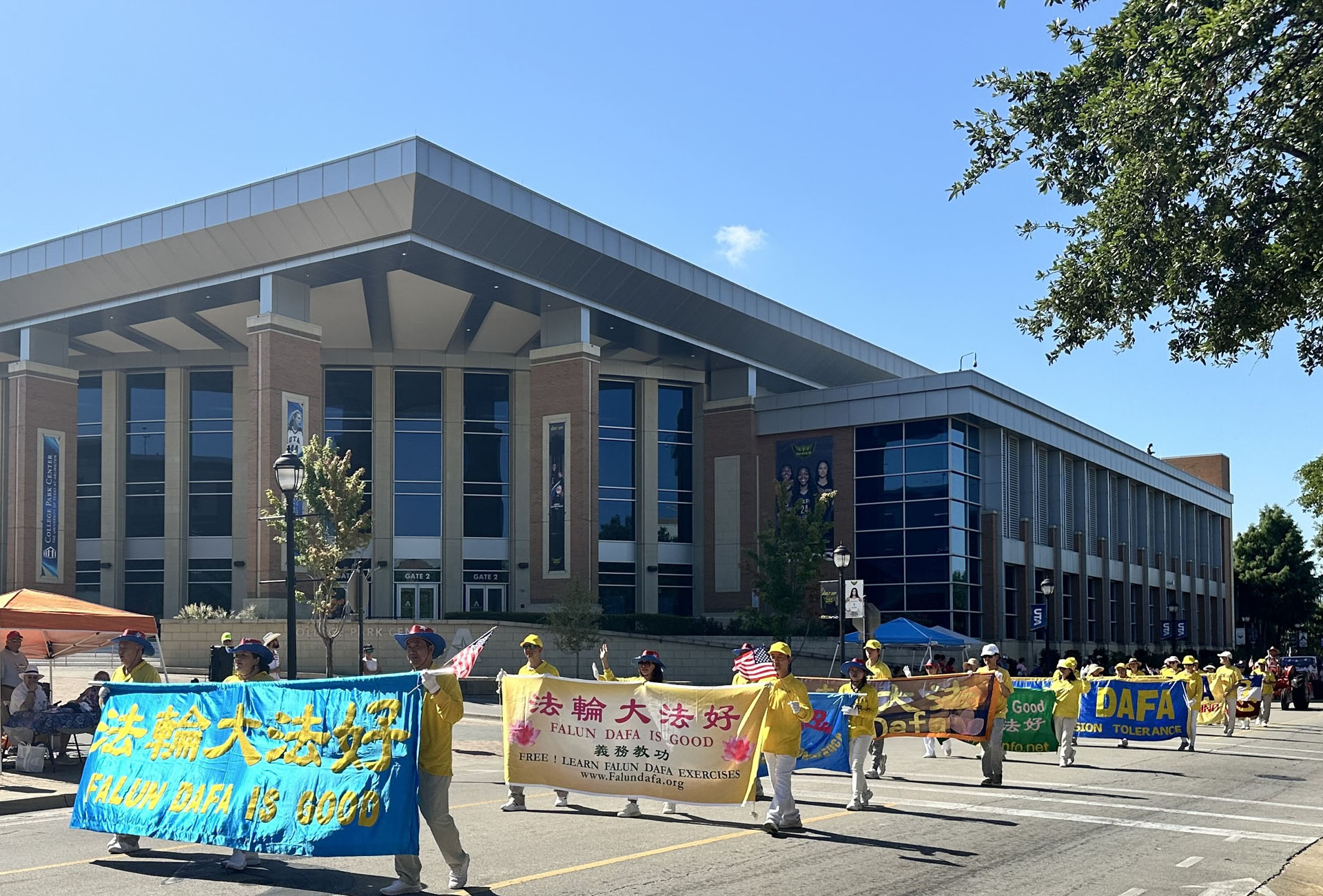 法轮功学员的队伍最前面是由写着“法轮大法、真善忍”的巨大横幅,然后是彩色花车和各式横幅,身着金黄色炼功服的学员在花车上演示着法轮功五套功法。打横幅的学员身着黄色T-恤衫、白裤、白鞋,并戴着美国国旗色彩的牛仔帽与游行的国庆气氛、西部牛仔风格相契合,沿途受到人们的热烈欢迎。