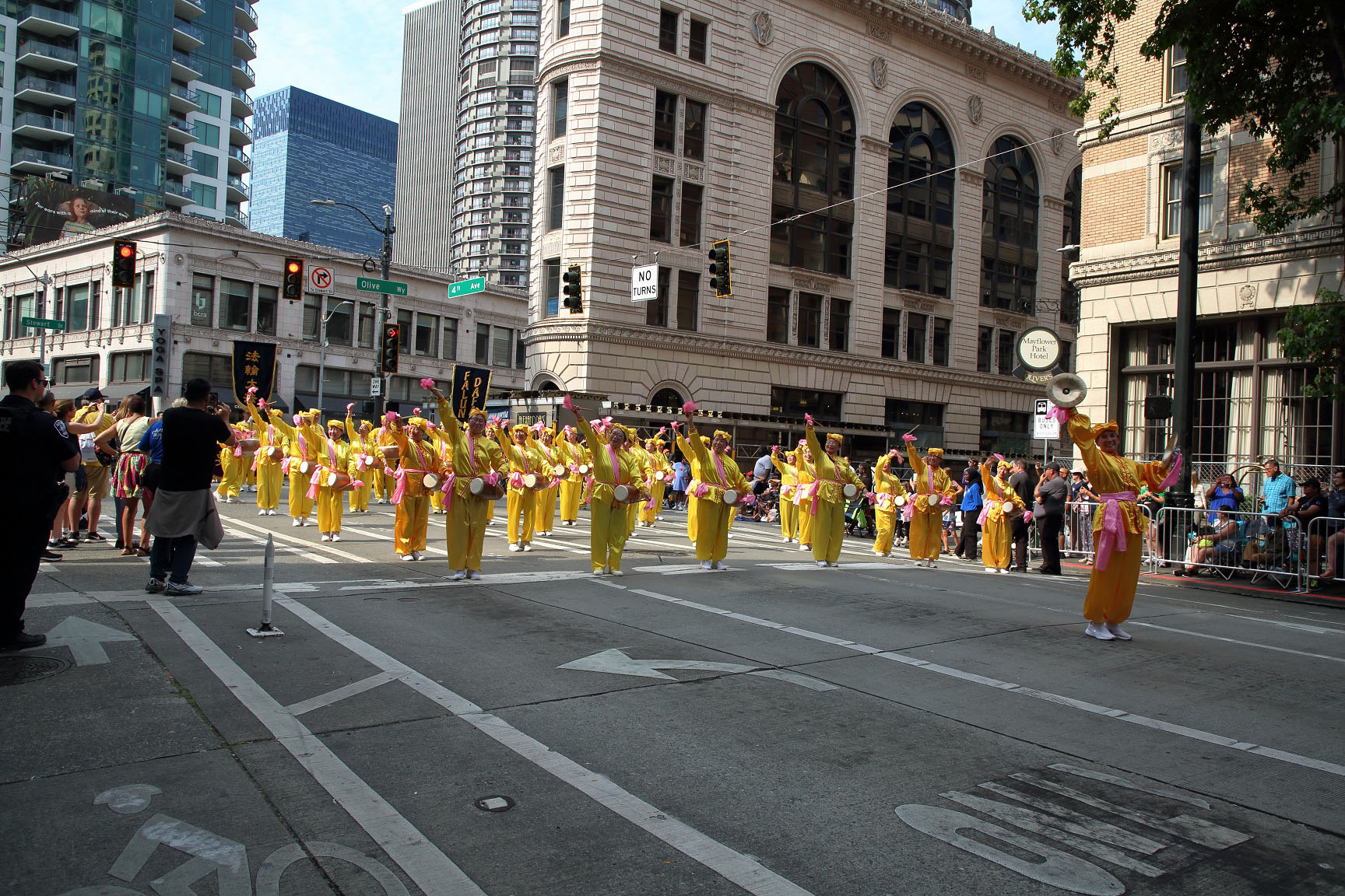 【明慧网二零二四年八月一日】二零二四年七月二十八日,西雅图民众迎来了一年一度的海洋节炬光游行(Seattle Torchlight Parade)。这是美国西北地区最具影响力的游行,已经有七十五年的历史了,今年有近一百个团体参加。不同族裔、不同文化背景、来自世界不同地区的人们聚集在这个美丽的城市里,他们展示和分享着各自的精彩,成为西雅图夏天里的一道亮丽风景。