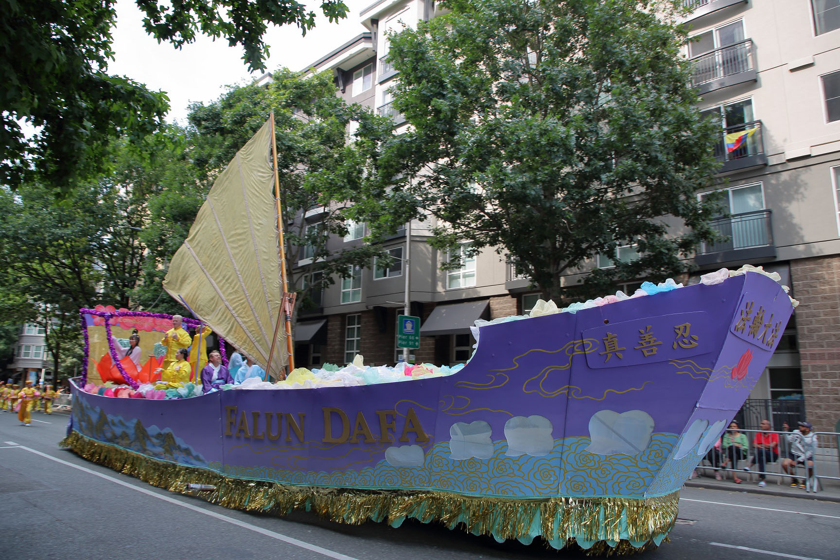 法轮功学员的游行队伍带来了一艘约十六米长、四米宽、三米多高的法船花车。她代表着法轮功学员们在得到救度后的感恩,同时她也在告诉世人,他们生生世世所为之等待的已经到来。在历年太平洋西北地区和加拿大的主要游行中,这艘法轮大法法船曾赢得过十七项大奖。