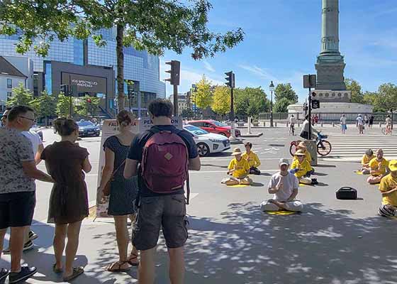 八月十日星期六,法轮功学员聚集南特市中心的皇家广场,向人们介绍法轮功,以及揭露中共迫害法轮功学员的真实情况。