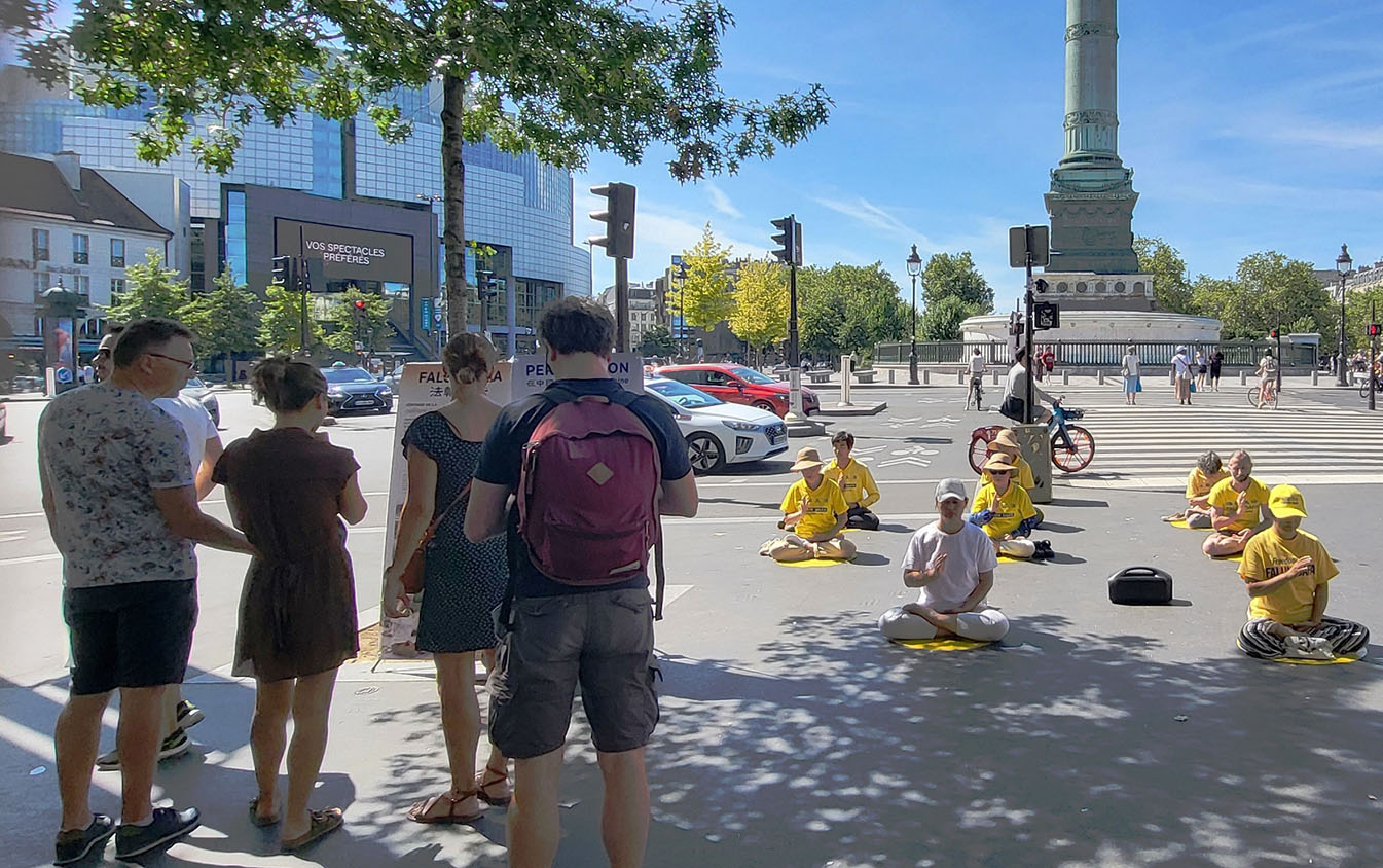 二零二四年八月十一日上午,法轮功学员在巴士底广场(Place de Bastille)举办了法轮功信息日活动,向民众和游人介绍法轮功,同时征集签名,反对中共对法轮功学员的迫害。