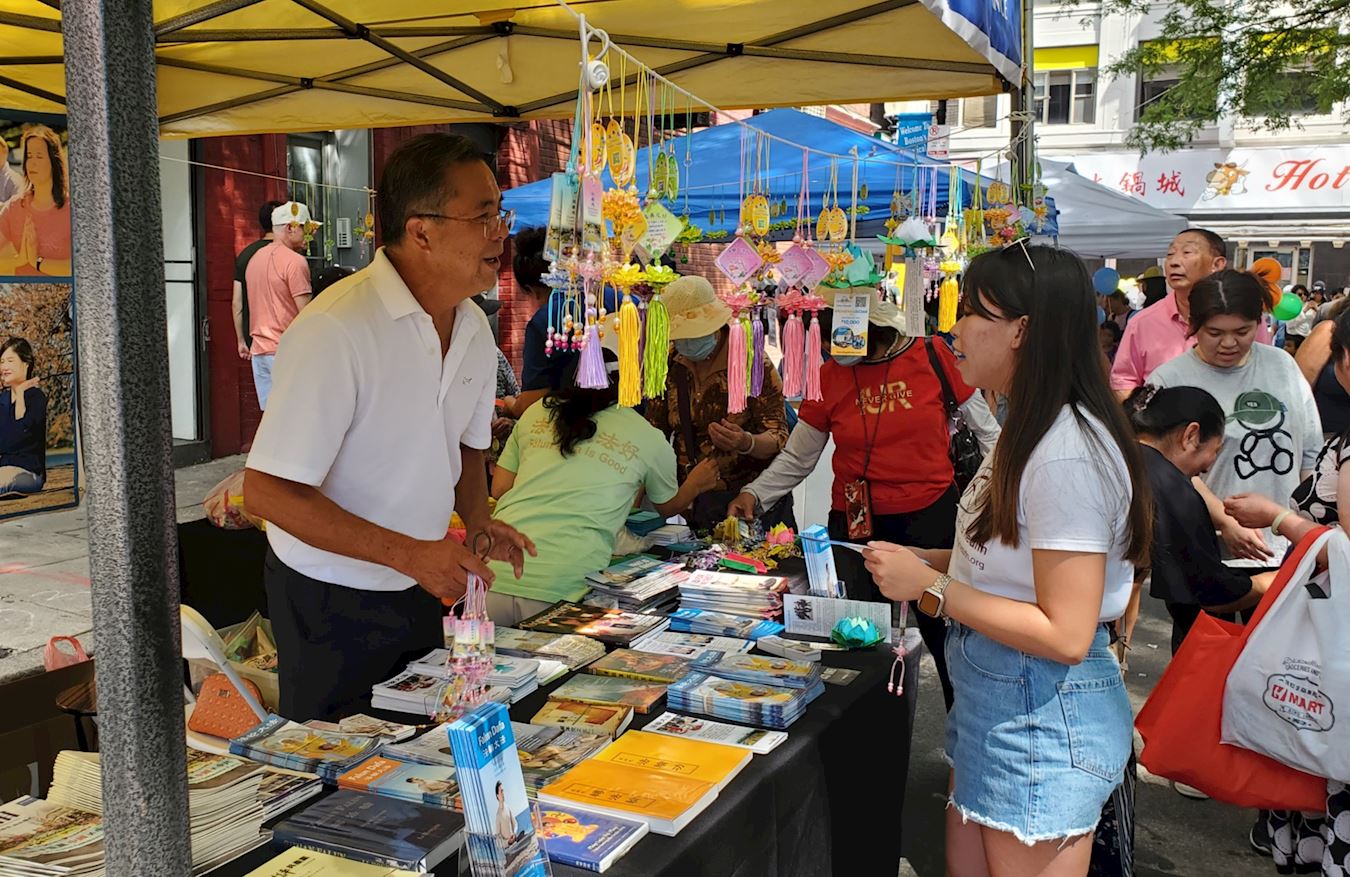 一位来自菲律宾的先生前来展位主动拿取资料,他说自己的太太了解法轮功,很有兴趣学炼。他本人也曾尝试炼功,当时就感到浑身充满能量,感觉很棒。他们询问到哪里可以学炼功法,学员介绍说中国城就有炼功点,同时告诉他们学炼功法的同时,也要通读《转法轮》。他们表示回去会读这本书。