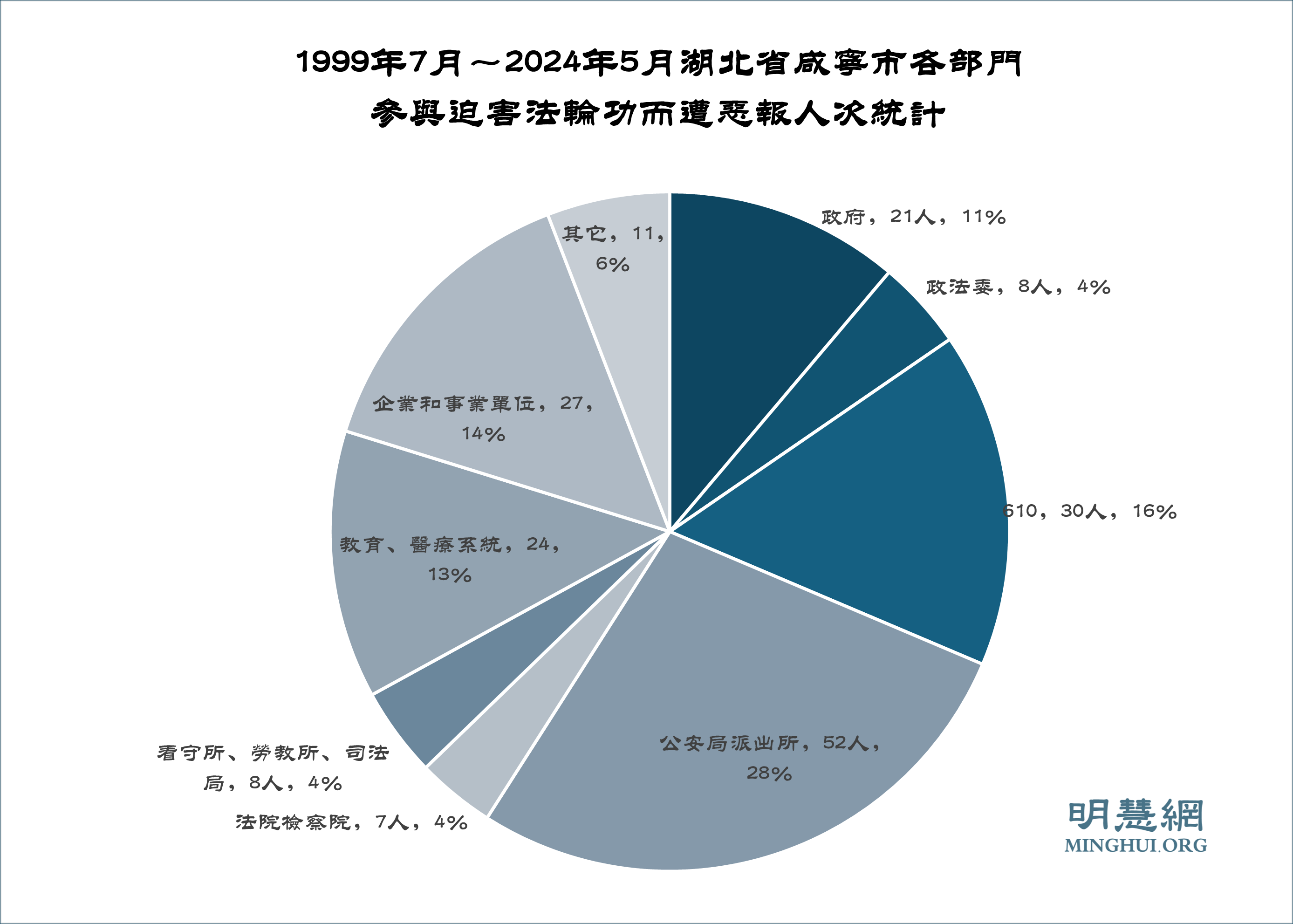 ![]() 图1:1999年7月~2024年5月湖北省咸宁市各部门参与迫害法轮功而遭恶报人次统计 |