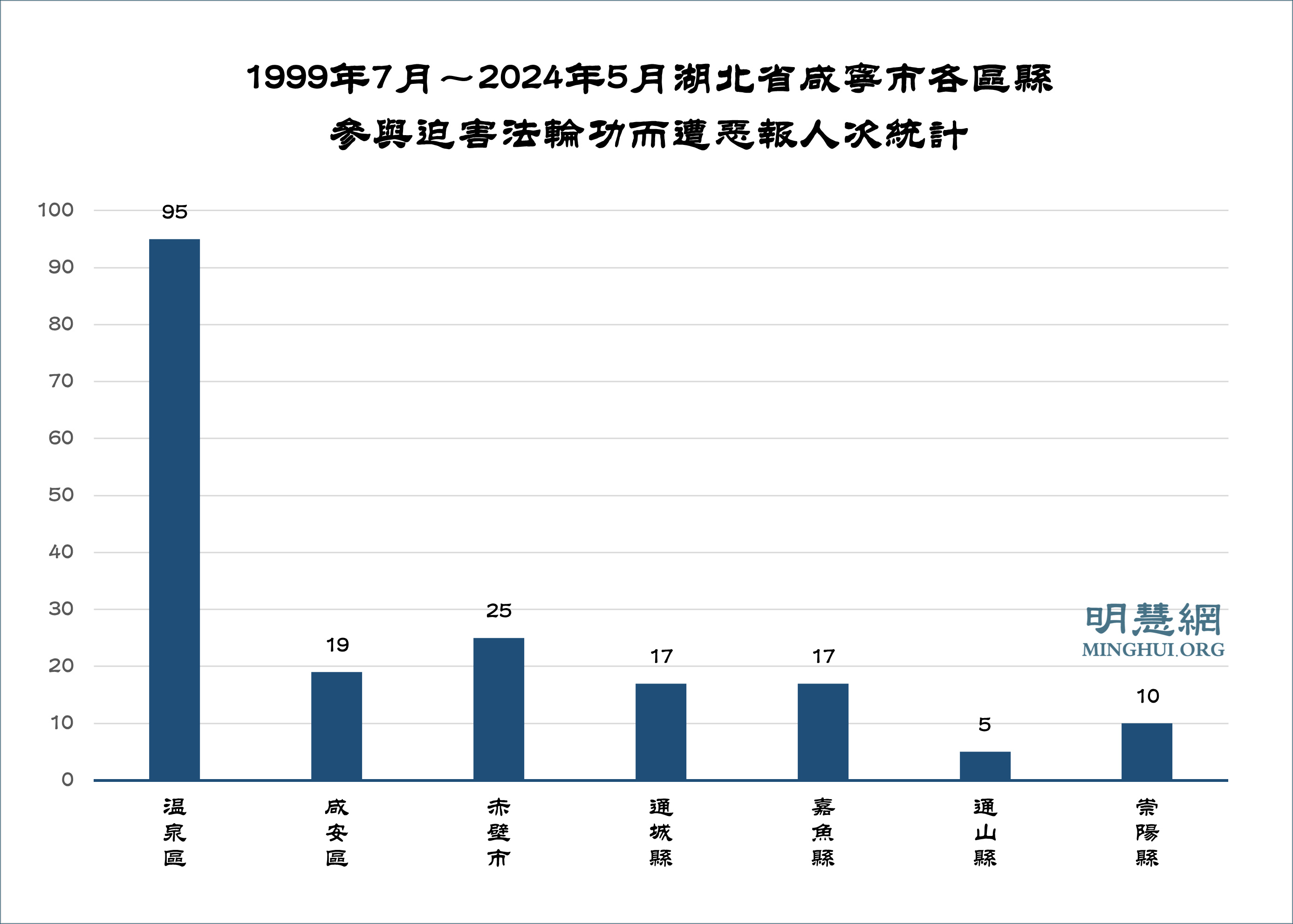 ![]() 图2:1999年7月~2024年5月湖北省咸宁市各区县参与迫害法轮功而遭恶报人次统计 |