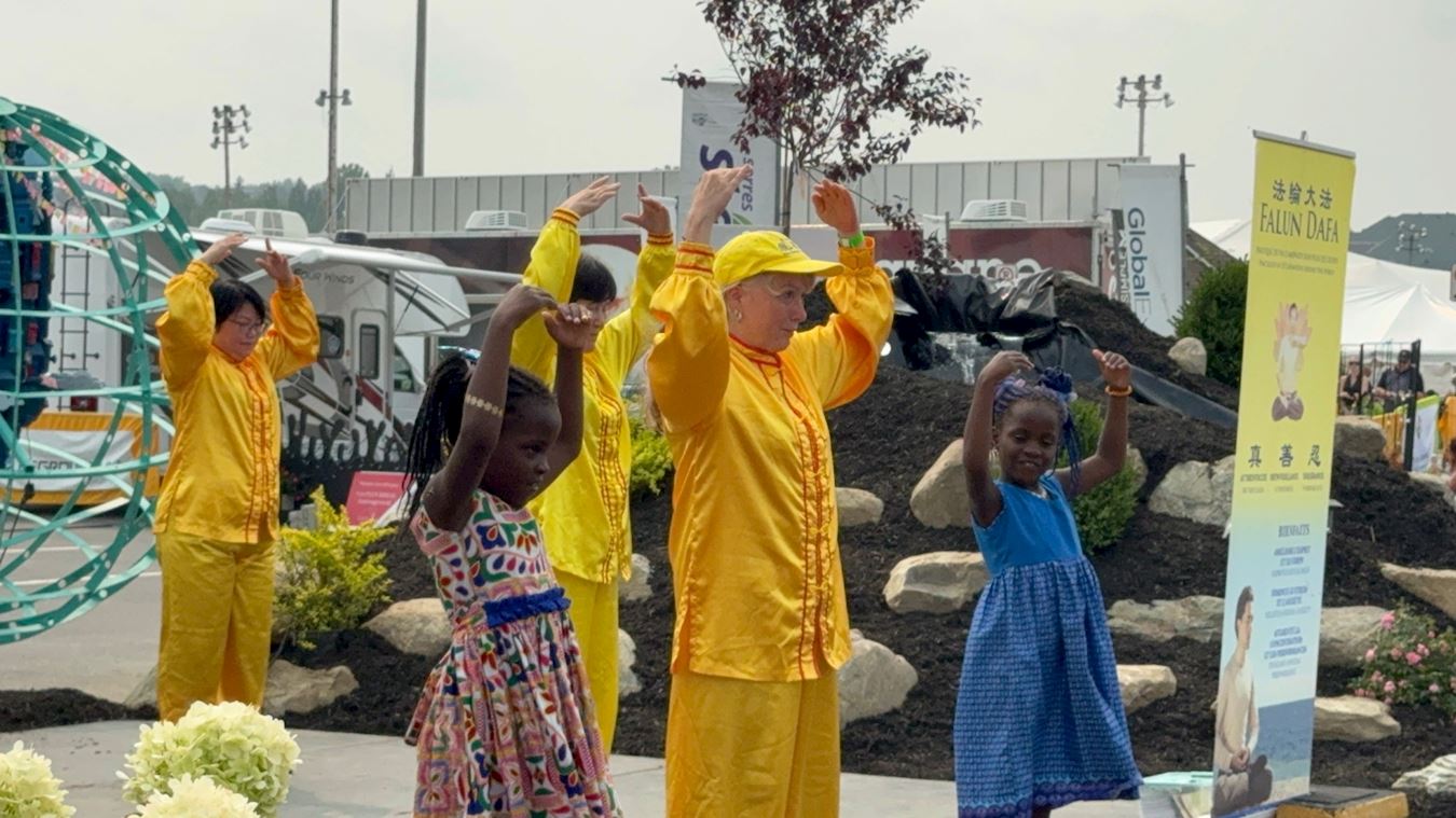 图6:法轮功学员展示功法时,吸引了民众的加入。包括十四岁的安东尼(Anthony,右一)。中间戴帽子女士炼功后表示:度过了美好的时刻。