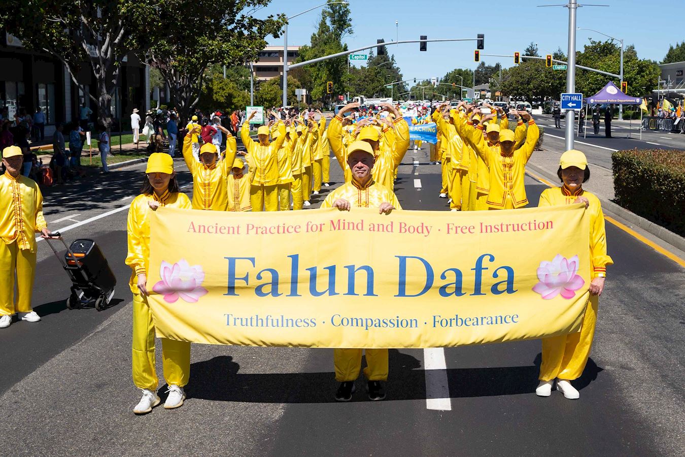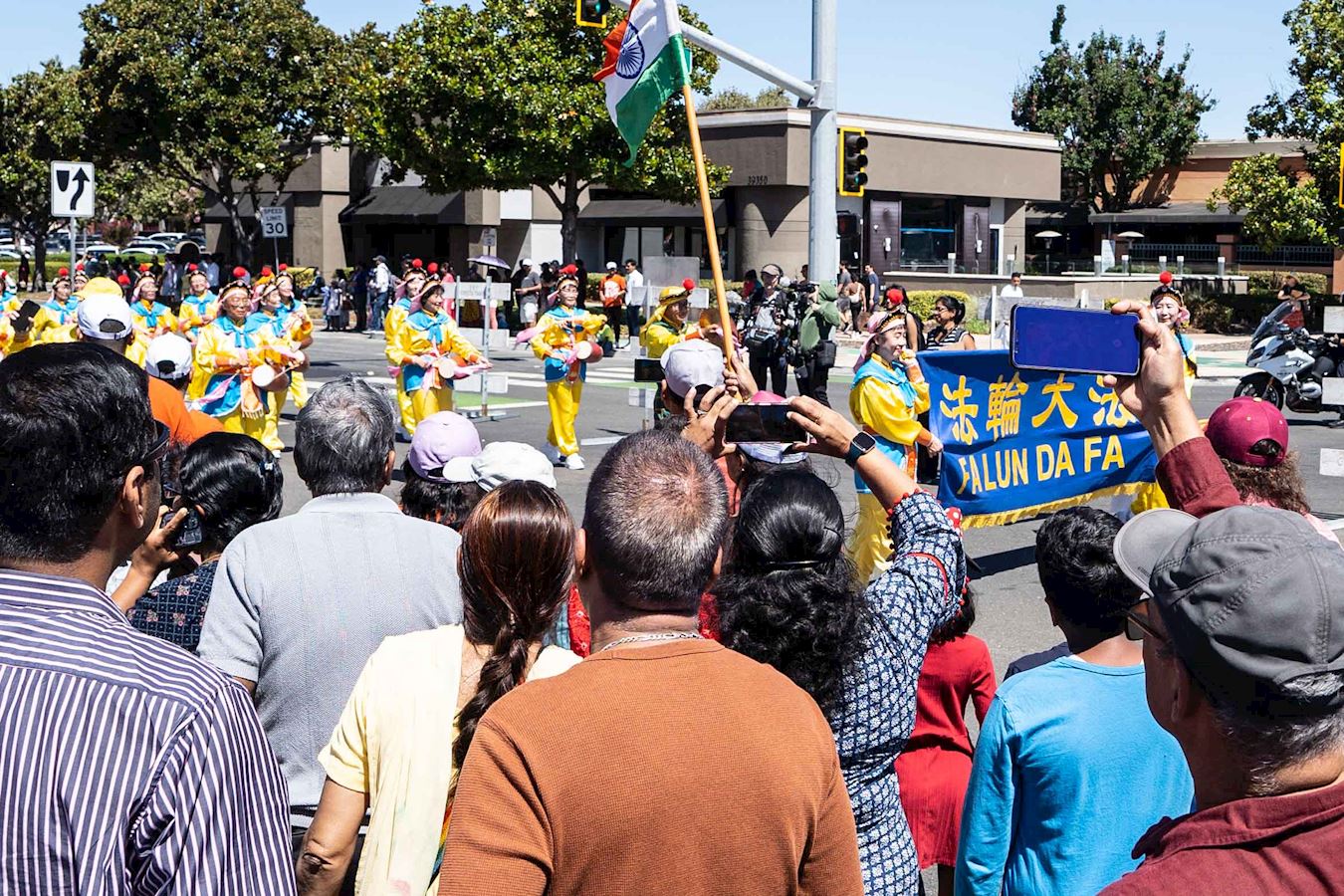 游行主办方的巴塔·查亚(Bhatta Charya)看法轮功学员的炼功队经过,邀请学员们在主席台前展示功法。她通过麦克风告诉大家,“现在来的是法轮大法的队伍,他们在佛利蒙有免费教功班。非常感谢你们。谢谢你们免费教功。”