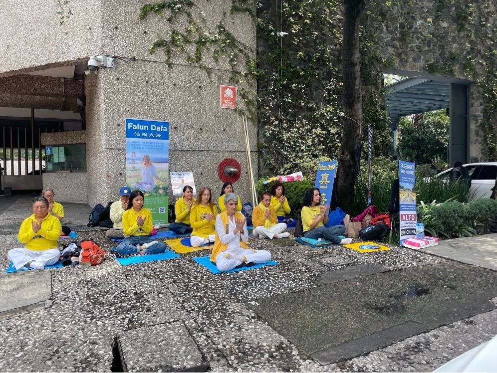二零二四年七月二十日,墨西哥学员在中共驻墨西哥城领事馆前举行和平集会,他们举起横幅,发放真相资料,并向路人展示五套功法。在中领馆附近的一条主要大街上,学员们展开真相横幅,散发传单,向路人讲述法轮大法的美好和中共迫害的邪恶。
