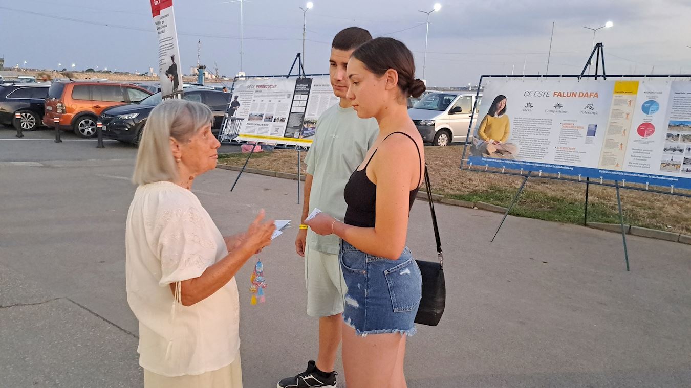 八月十一日康斯坦察,学员将传单递给另一位先生,他说:“这是一个神圣的信息:真、善、忍。如果你不珍惜面前的人,神如何珍惜你!祝你有一个幸福而光明的一天!”