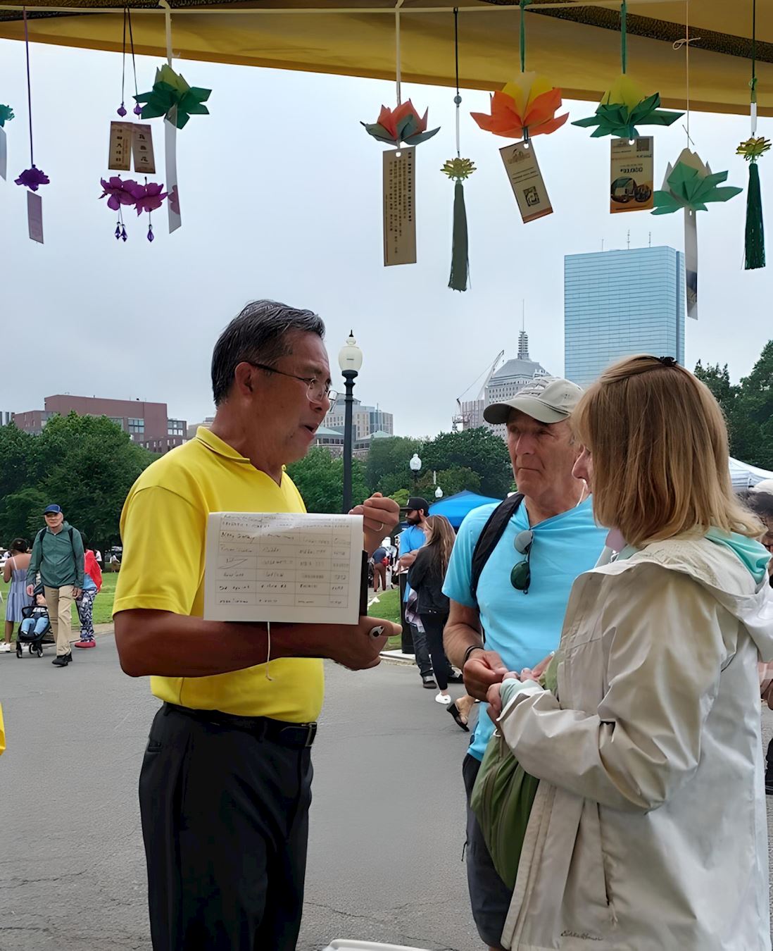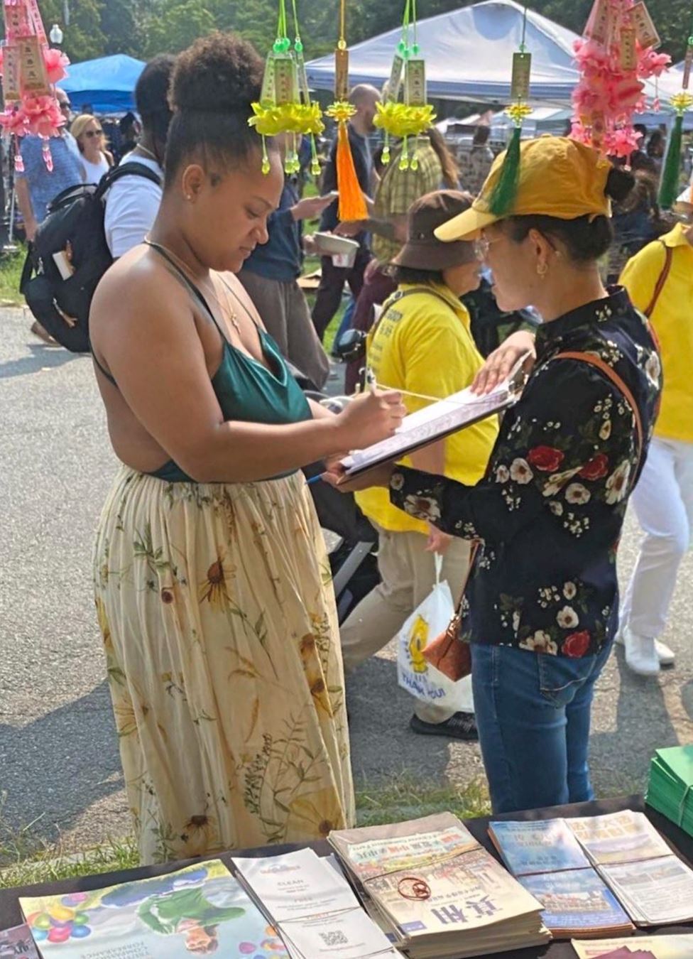一对从中国大陆来美的年轻留学生来到了法轮功展位,女孩很认真地听学员讲,并问真、善、忍的“忍”字怎么理解,学员讲了自己的理解,并举例“忍”为什么要能做到打不还手,骂不还口,学员给这个女生继续解答了几个问题,同时讲了中共迫害法轮功的真相并揭露了中共的邪恶本质。临走时,女孩和学员拥抱并感谢学员与她真诚地分享,使她对以前不太清楚的事情有了深入地了解。