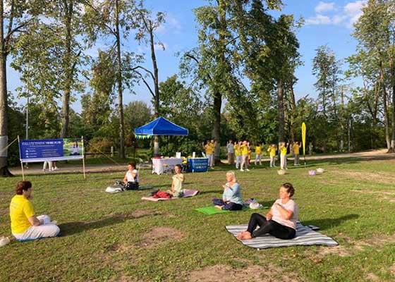 法轮功学员8月17日在节日现场向游客介绍法轮功以及大法对改善身心健康的巨大作用。他们演示了五套功法,为人们免费教授法轮功功法。