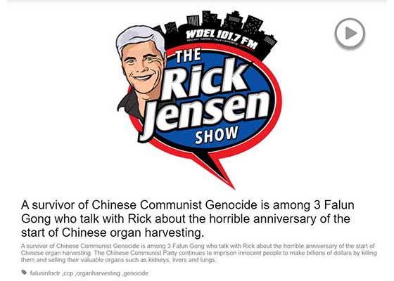 美国知名脱口秀主持人瑞克·约翰逊,邀请了三位法轮功学员在特拉华州WDEL电台做了18分钟的专题节目,揭露中共迫害法轮功及其活摘法轮功学员器官的罪行。