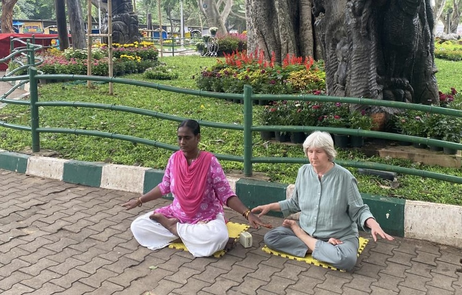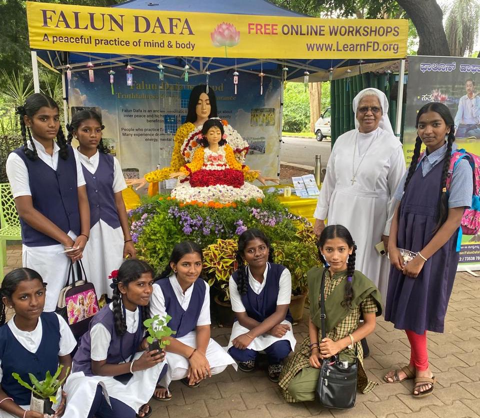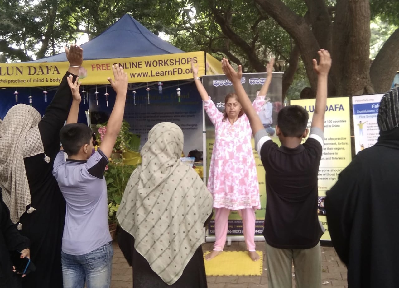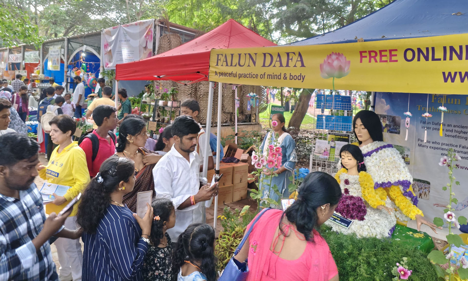 学员们向大家分发印地语、英语、卡纳达语、泰卢固语、泰米尔语和马拉雅拉姆语的真相传单,并介绍了什么是法轮功和真、善、忍的修炼准则,中国法轮功学员二十五年来在反迫害中展现的大善与大忍赢得了现场民众的支持与同情。
