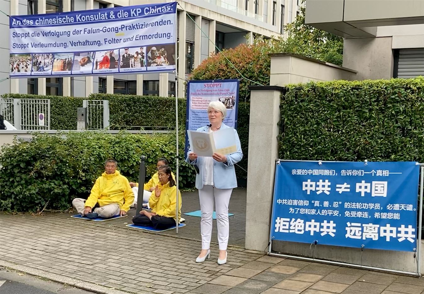![]() 图1~2:二零二四年七月二十四日,法轮功学员宣读了致中共驻杜塞尔多夫总领事杜春国的公开信,之后把信函投入了中领馆的信箱。 |