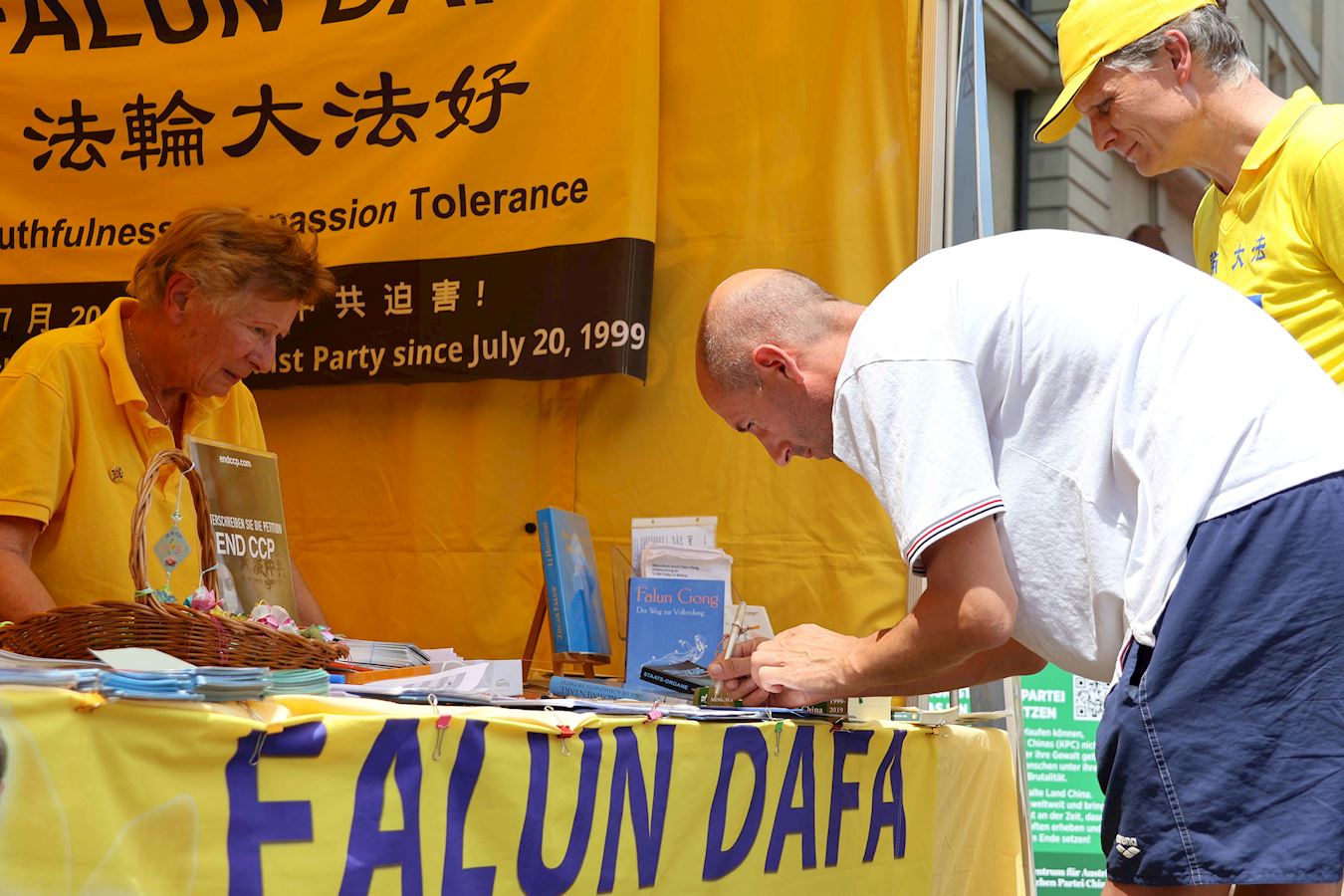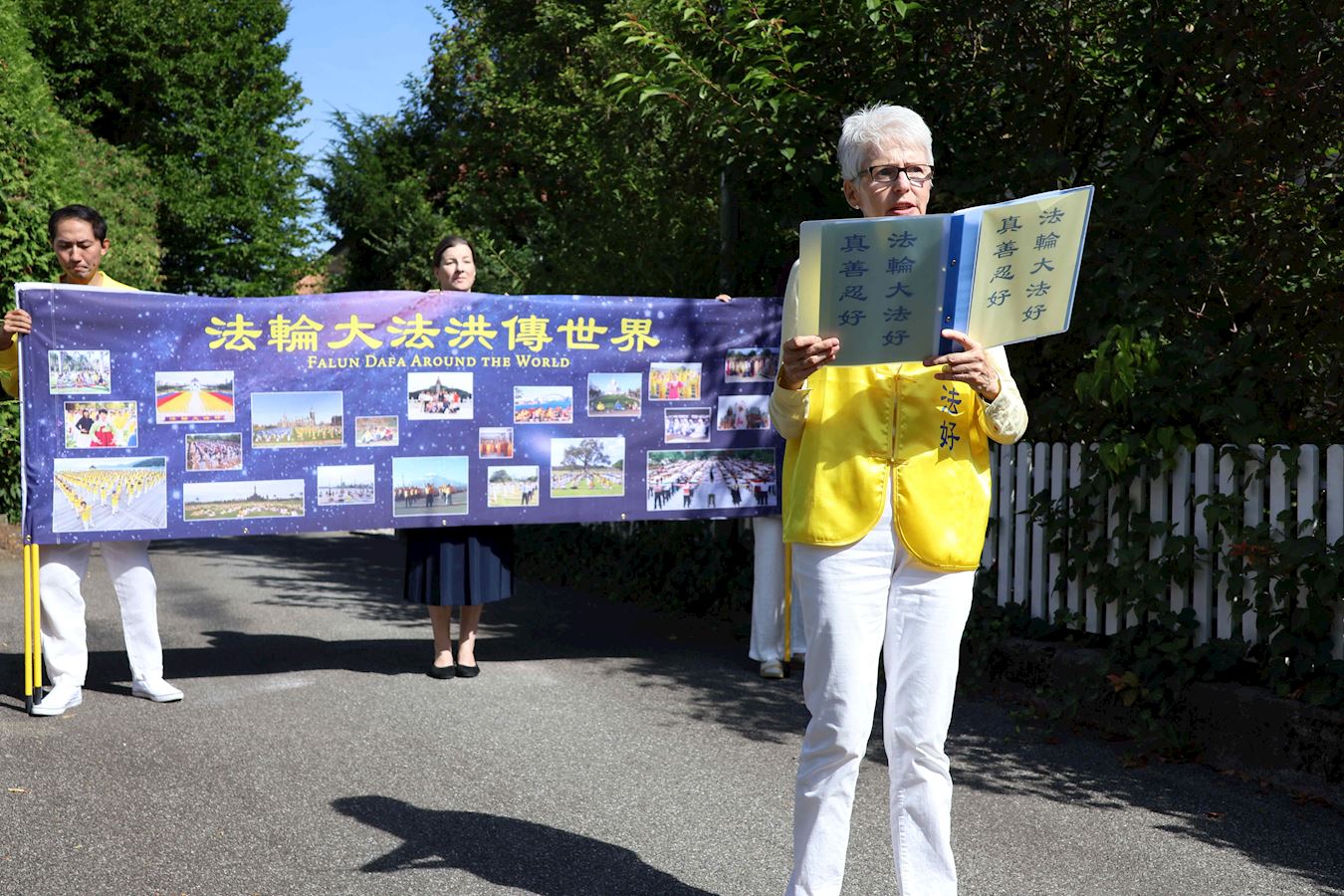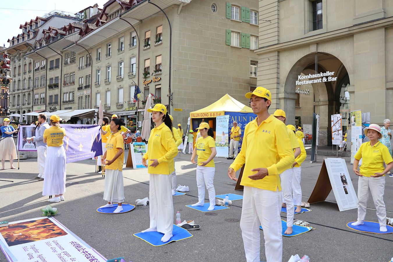当天下午,丹尼尔和很多路人在原本空旷的广场上看到了不同的展板及横幅。一组身着明亮的黄T恤的男女老少随着优美的音乐做着平缓舒展的动作。当旁边演讲开始时,他们会盘腿打坐,安静祥和,如与周围的车水马龙隔离了一般。
