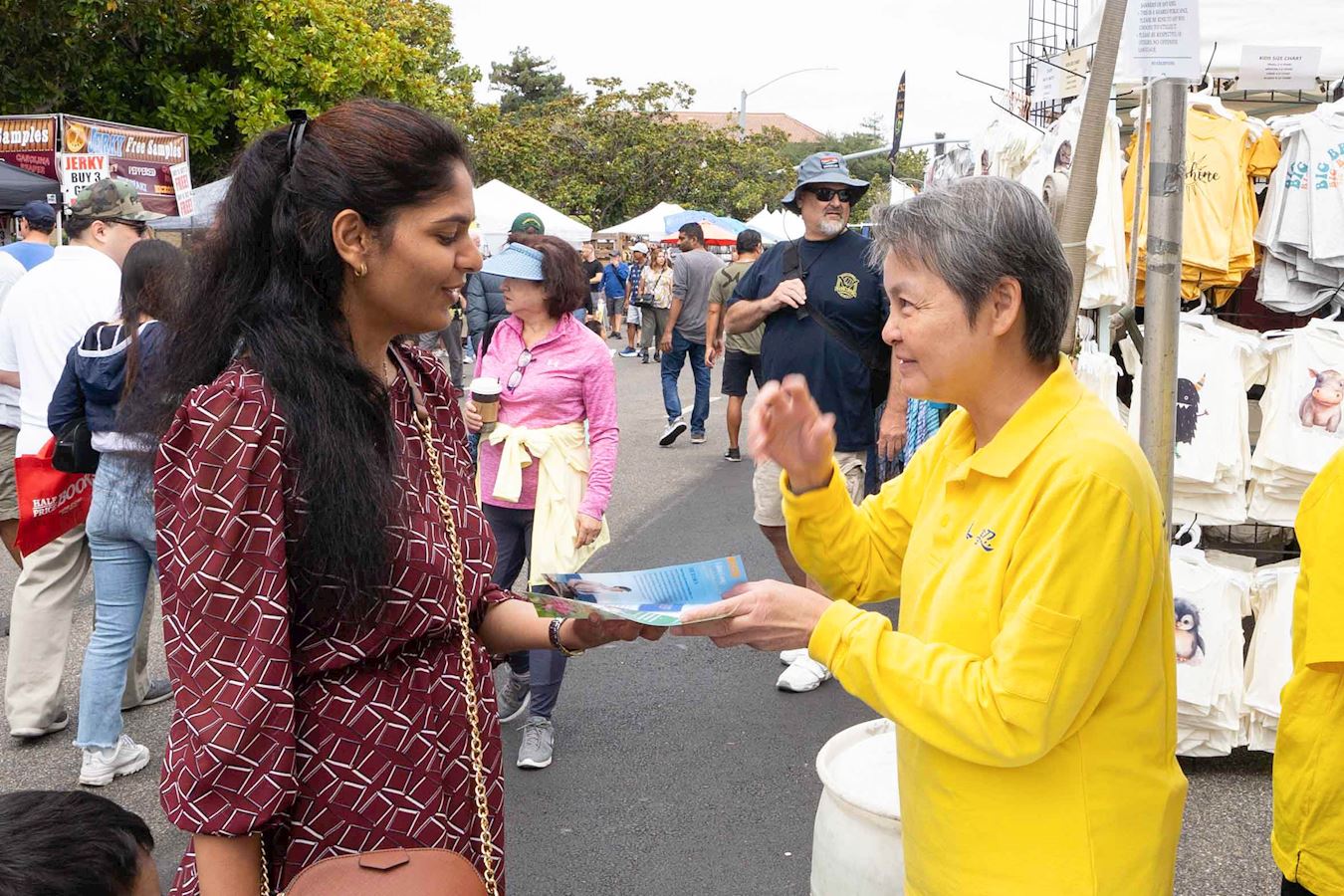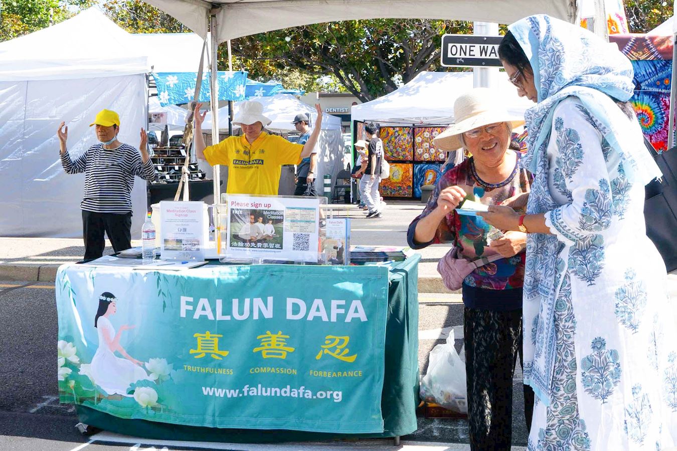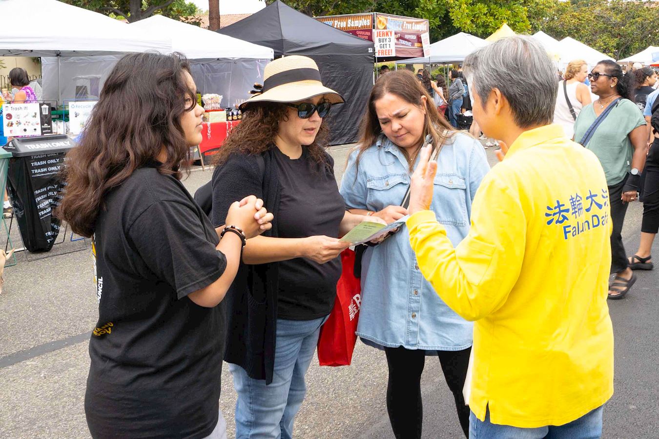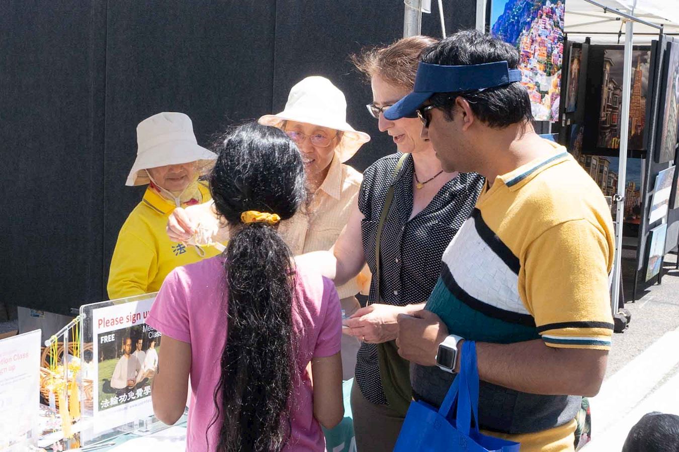 乔(Joe)和太太辛迪(Cindy)经过法轮功展位时,骄傲地说,他们上个月在旧金山看到了法轮功学员的游行。乔说,“我在七月二十日看到了法轮功学员在旧金山的游行,队伍很长,非常壮观,他们在抗议中共对法轮功的迫害,我知道中共是残暴的,中共甚至不让人有思想自由。”