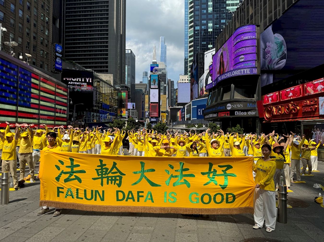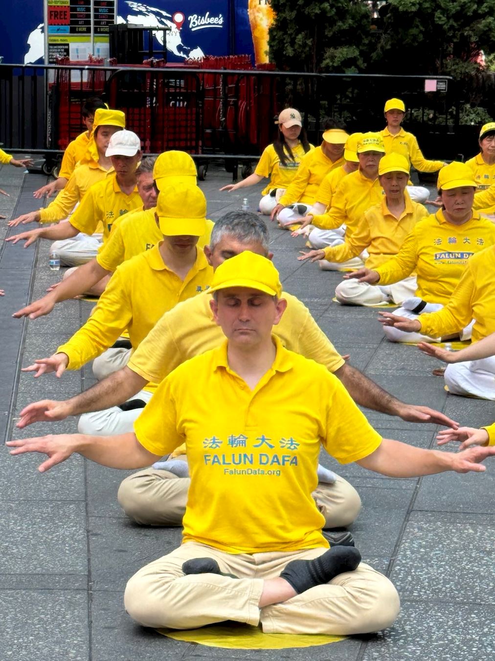 【明慧网二零二四年八月六日】二零二四年八月三日,在熙熙攘攘的纽约曼哈顿时代广场(Times Square),各族裔法轮功学员无畏酷暑,向民众演示法轮功五套功法。纽约地区的居民和来自世界各地的游客被这宁静祥和的景象的炼功场面吸引,纷纷驻足观看。他们拍照、接过法轮功学员发放的传单,并聆听学员介绍法轮功,很多人表示要进一步了解法轮功,有的当场打开法轮大法网站进行了解,还有的当场学功。