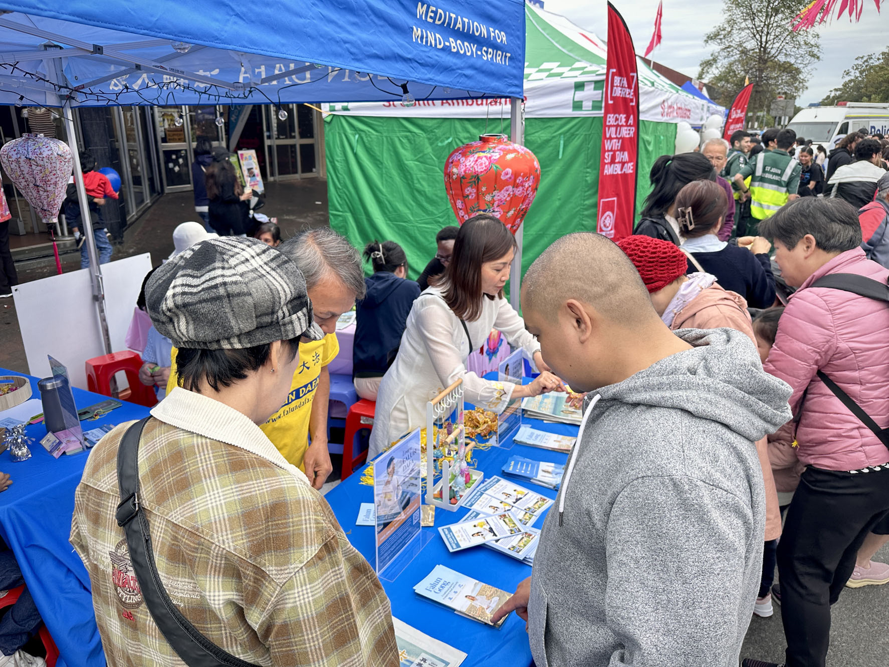 在悉尼各地庆典活动中的法轮功咨询展位前,络绎不绝的有缘人前来了解法轮大法或获取简介单张。许多人对学炼法轮功表现出了浓厚的兴趣。两天活动中有六十多位民众注册登记、期望学炼法轮功。