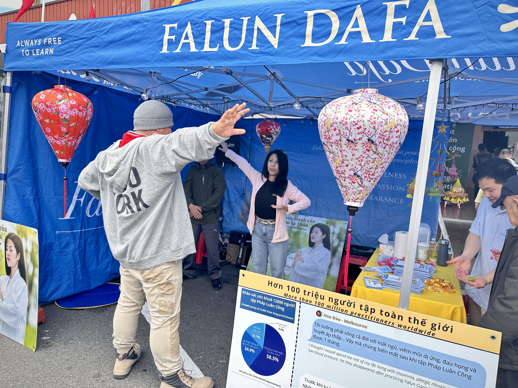 法轮大法展位在悉尼艺术节的庆典活动中格外醒目,吸引着众多民众驻足了解法轮大法的美好,他们感受着法轮功学员演示功法的纯正能量,许多人对学炼法轮功表现出了浓厚的兴趣。两天活动中有六十多位民众注册登记并希望参加附近地区的免费教功活动。