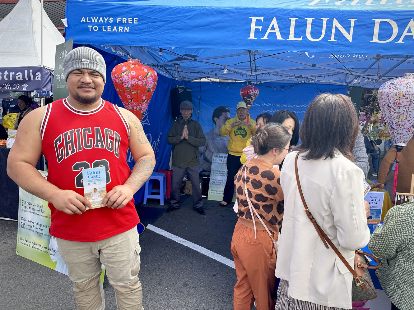 游客佩萨米诺·奥库西蒂诺(Pesamino Aukusitino)在法轮功展位前驻足,因为他觉得非常有趣,就请法轮功学员教他炼功。学完一套功法后,他表示:“感觉非常好,很放松。”