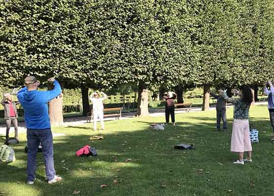 在甲辰中秋到来之际,丹麦法轮功学员在哥本哈根国王公园炼功,并向师父问好,恭祝师父中秋快乐!