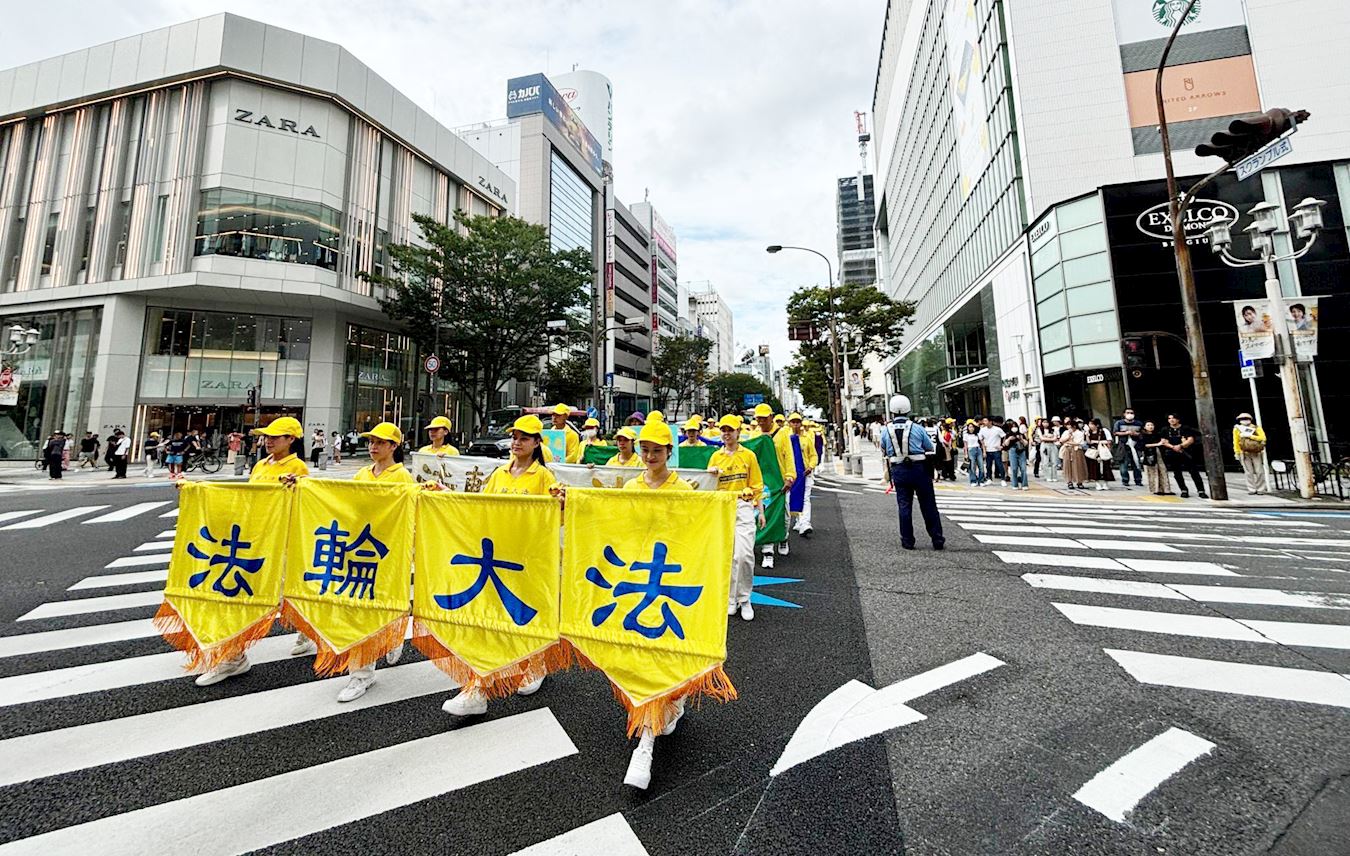 '图4~8:二零二四年九月十五日下午,法轮功学员们在名古屋市中心的繁华地段荣附近进行了两个多小时的游行。游行队伍途经热闹的大街,沿途车水马龙、行人络绎不绝。'