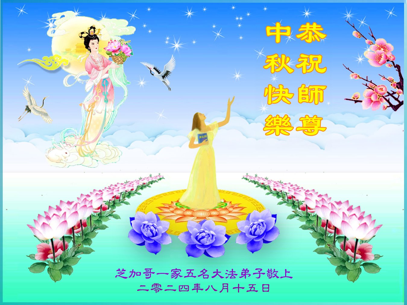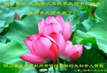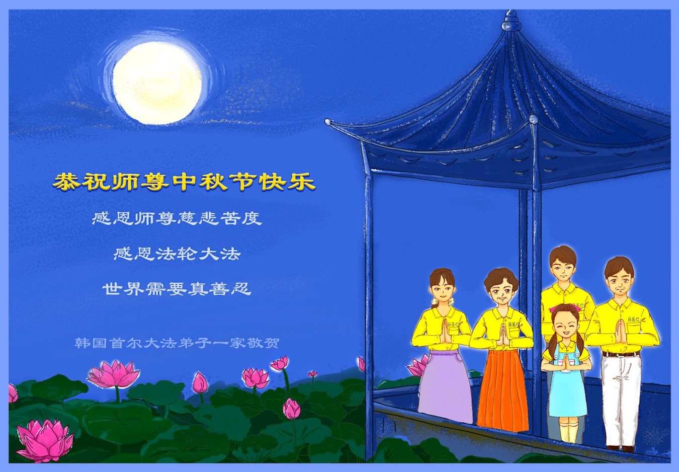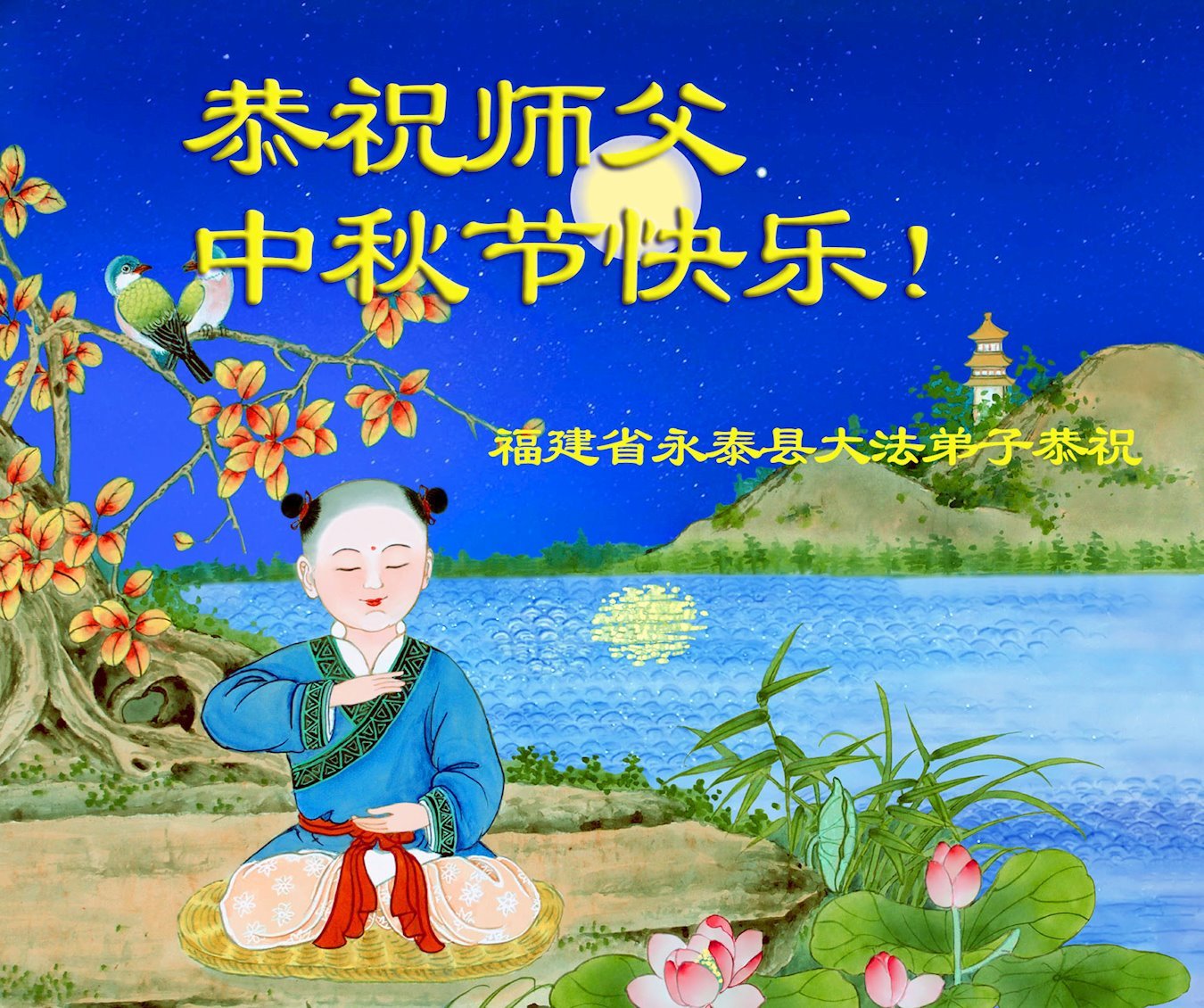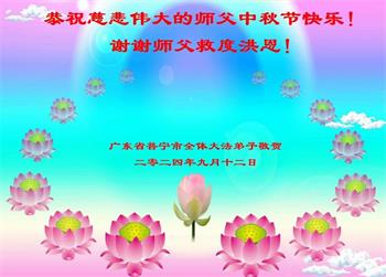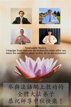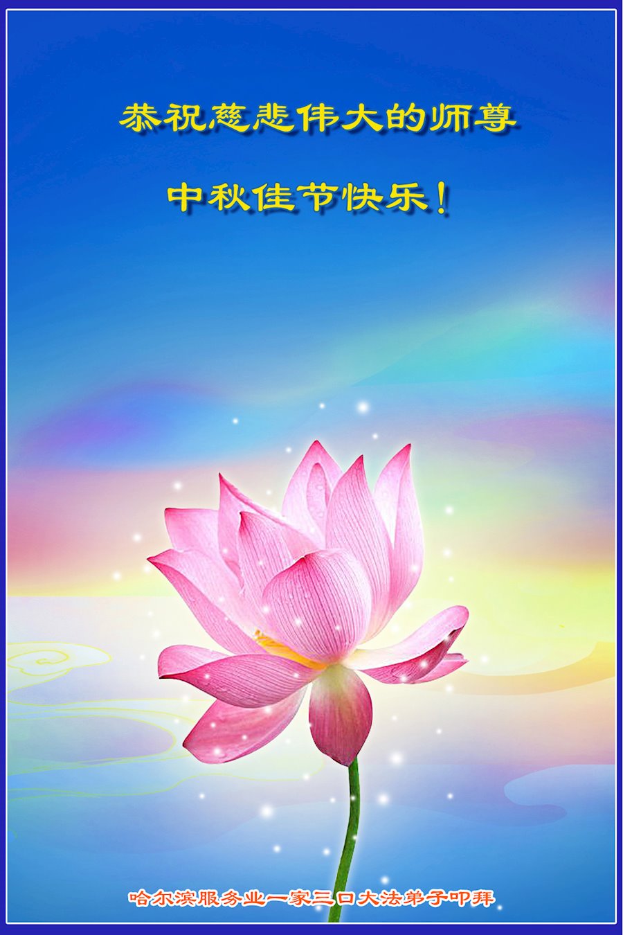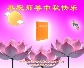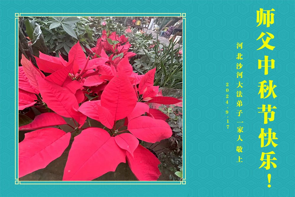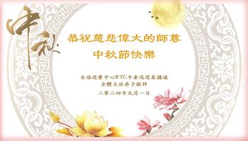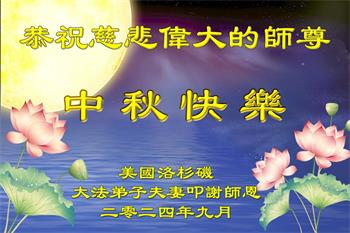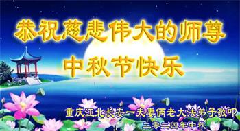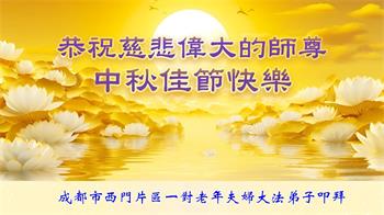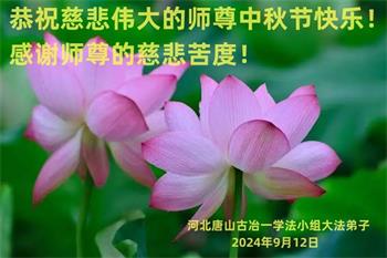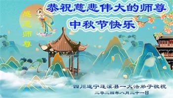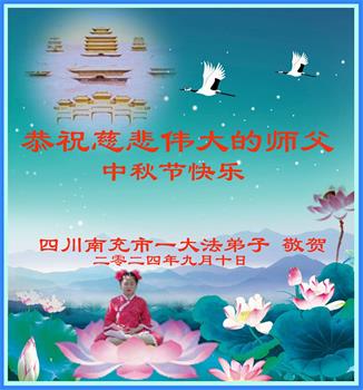 弟子和家人同修恭祝师父中秋节快乐!感恩师父对弟子和家人同修的一路慈悲看护!弟子也感恩师父对弟子的一切慈悲安排!弟子一定努力多学法炼功,用心做好救人的事情,修去妒嫉心,怨恨心,及人心,人念,人情,努力做好师父让弟子做的救人的事,跟随师父回家!